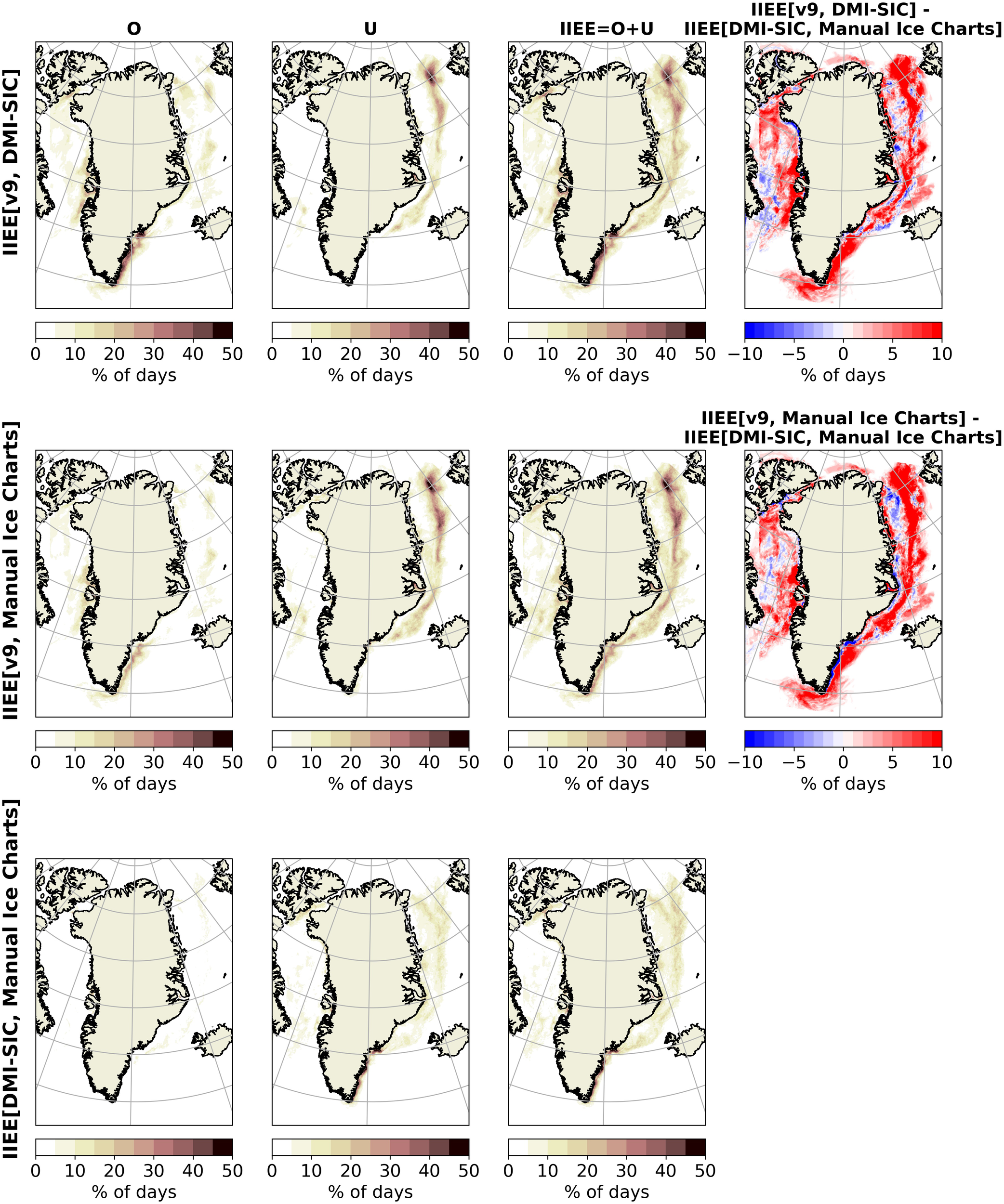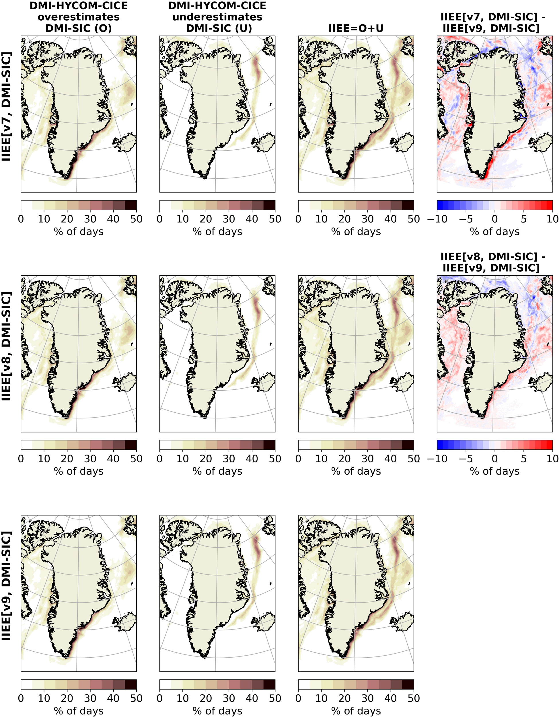 Cumulative occurrence of days (in percentage) in which the model outputs from v7 (first row), v8 (second row), and v9 (third row) experiments overestimate (first column) or underestimate (second column) the DMI-SIC observational product regarding the 15% sea ice concentration threshold. The third column shows both overestimation and underestimation cases. The fourth column shows the differences IIEE[v9, DMI-SIC] - IIEE[v7, DMI-SIC] (first row) and IIEE[v9, DMI-SIC] - IIEE[v8, DMI-SIC] (second row).