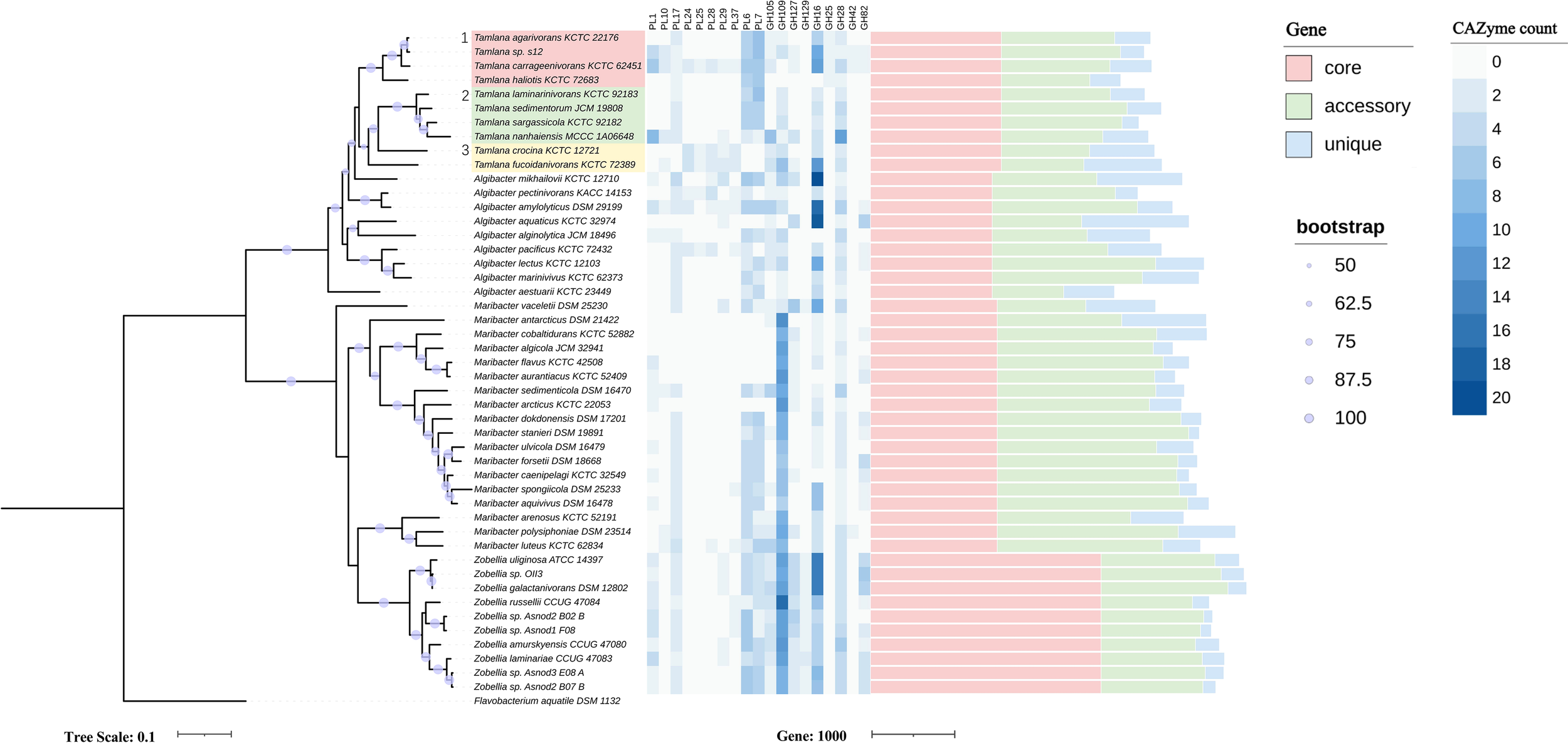 Maximum-likelihood phylogenetic tree based on 120 core genes (left panel), numbers of genes from selected carbohydrate-active enzymes (CAZyme) families (middle panel) and pan-genome (right panel) in Tamlana sp. S12 and related strains. Flavobacterium aquatile DSM 1132 served as outgroup. The three resolved Tamlana lineages are numbered and colored. PL, polysaccharide lyase; GH, glycoside hydrolase.