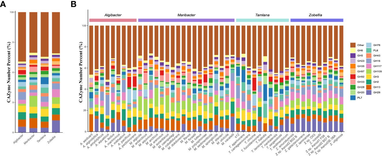 PL7 and PL6 accounted for the highest proportion of CAZymes in Tamlana, while GH16 and GH2 proportions dominated in Algibacter. The proportion of GH109 in the CAZymes of Zobellia and Maribacter was higher than that in other genera (Figure 2A). GH109 is involved an NAD+-dependent hydrolysis mechanism that cleaves N-acetylgalactosamine residues from various substrates, such as glycolipids, glycopeptides, and glycoproteins (Malinski and Singh, 2019; Gavriilidou et al., 2020). These substrates are abundant in the macroalgal matrix (Kalisch et al., 2016). GH109 in Zobellia and Maribacter may provide adaptive mechanisms for these substrates.