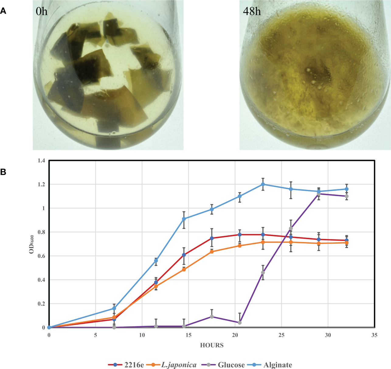Degradation of L. japonica by Tamlana sp. S12 and growth analysis of Tamlana sp. S12 on different mediums. (A) Degradation of L. japonica by strain S12 in minimal medium with L. japonica pieces at 0Â h and 48Â h post-inoculation, (B) Shows the growth curve of strain S12 in four medium.