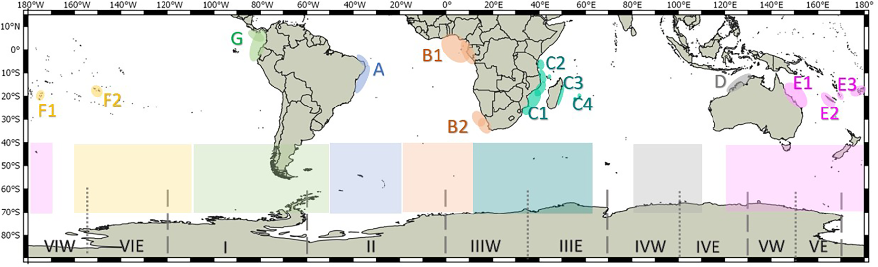 Distribution of the core breeding and primary feeding grounds of the Southern Hemisphere humpback whale Breeding Stocks A – G, and Southern Ocean Management Areas I – VI and sub-areas (Donovan, 1991; IWC, 1998; IWC, 2006). Colors are used to indicate the breeding and feeding grounds used by each breeding stock and sub-stock. Dashed lines indicate the limit of the main Management Areas, whereas dotted lines are marking the limits of sub-areas (W = west and E = east). Areas and sub-areas limits are: I = 120°W–60°W; II = 60°W–0°; III = 0–70°E (IIIW = 0–35°E and IIIE = 35°E–70°E); IV = 70°E–130°E (IVW = 70°E–100°E and IVE = 100°E–130°E); V = 130°E–170°E (VW = 130°E–150°E and VE = 150°E–170°E); and VI = 170°E–120°W (VIW = 170°W–155°W and VIE = 155°W–120°W).