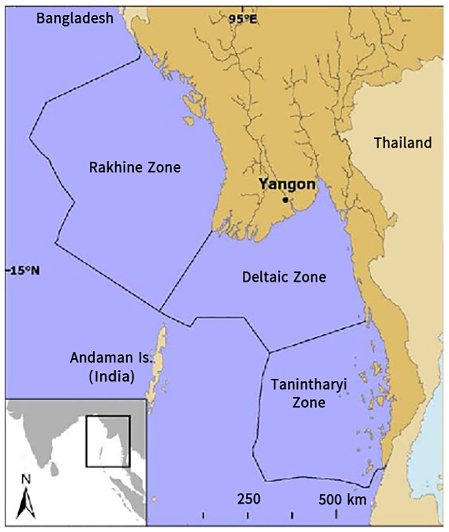 Map showing the location of Myanmar in the Bay of Bengal and the three main fishing zones for hilsa (source Harper et al., 2011).
