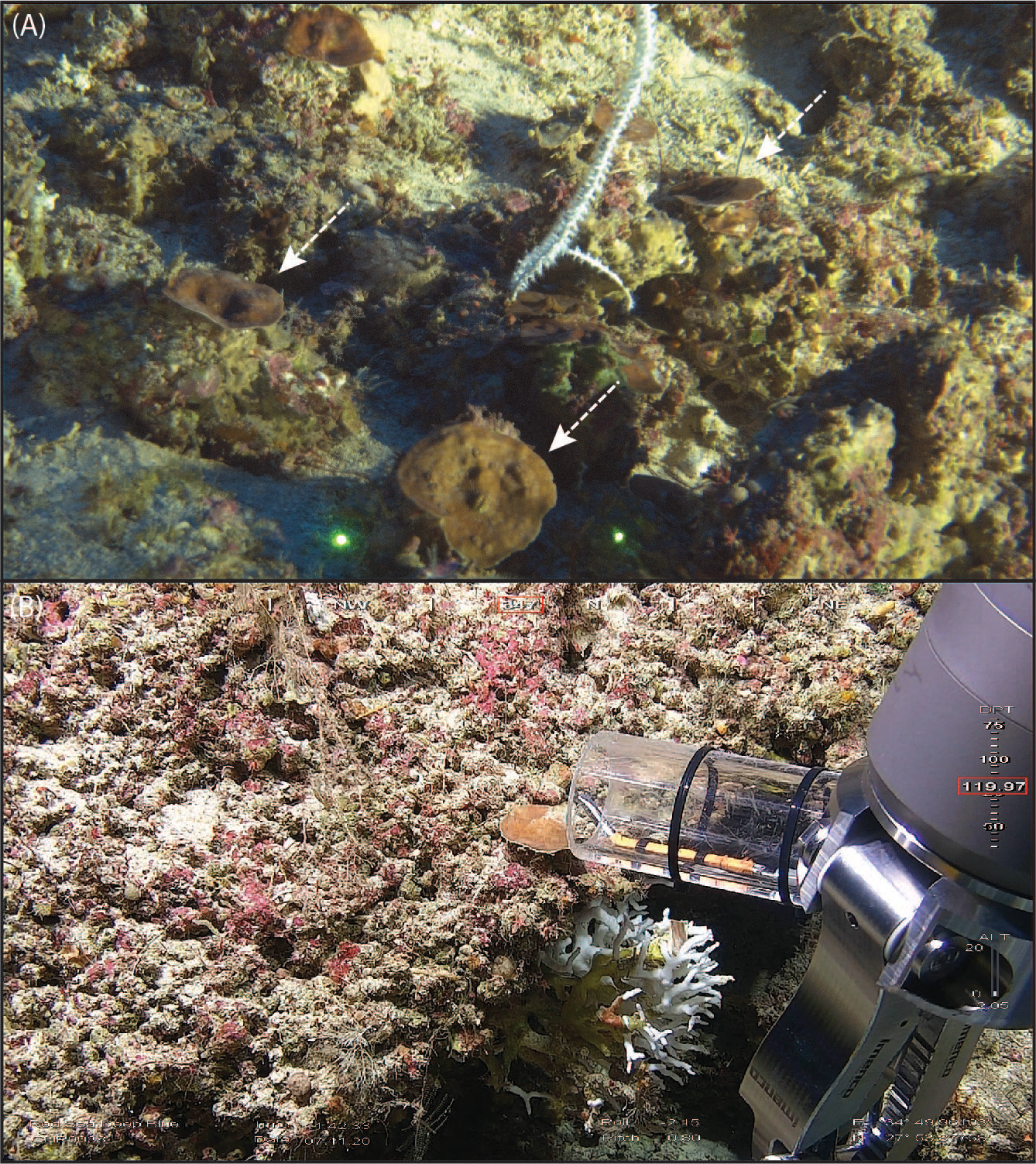 In situ pictures of some Leptoseris cf. striatus specimens analyzed in this study. (A) Different L. cf. striatus colonies (pointed with arrows) found during dive NTN0035. (B) Sampling of CHR0038_17.