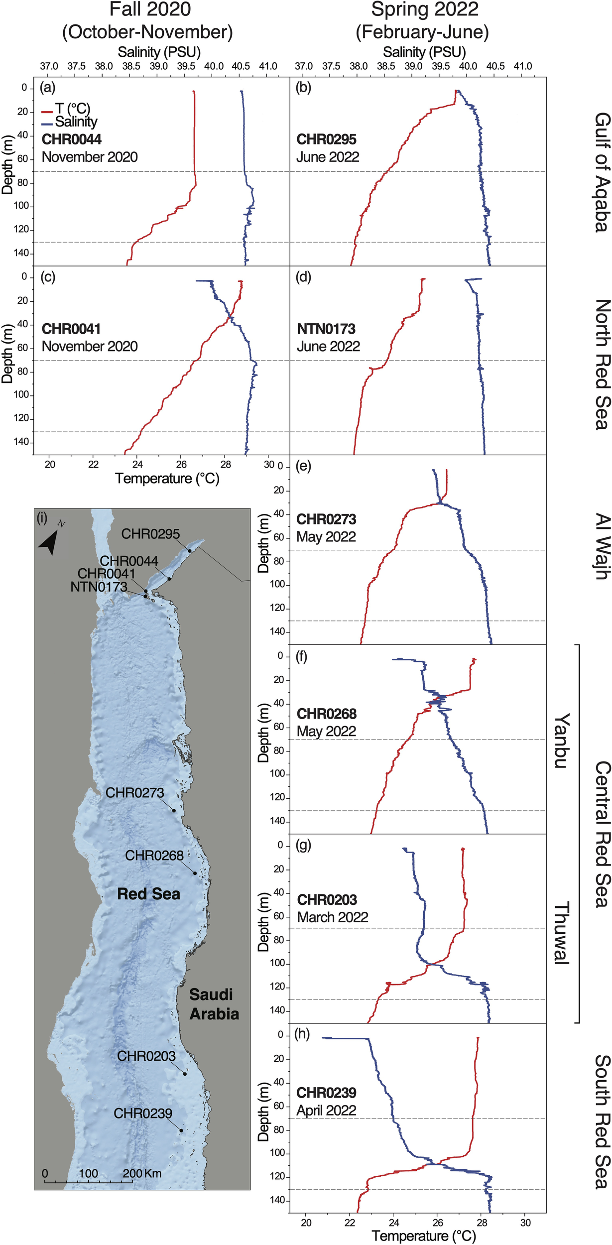 Environmental parameters (temperature, and salinity) measured with the RBR CTD along the five regions we investigated during two different seasons, namely (A, B) Gulf of Aqaba, (C, D) North Red Sea, (E) Al Wajh, (F, G) Central Red Sea (Yanbu and Thuwal), (H) South Red Sea. The depth range focused in this study (70-130 m) is highlighted with grey dashed-lines. Temperature profile is in red and salinity profile is in blue. (I) Map of the Saudi Arabian Red Sea showing RBR CTD sampling sites. ESRI World Oceans Basemap, source: Esri, GEBCO, NOAA, National Geographic, DeLorme, HERE, Geonames.org, and other contributors.