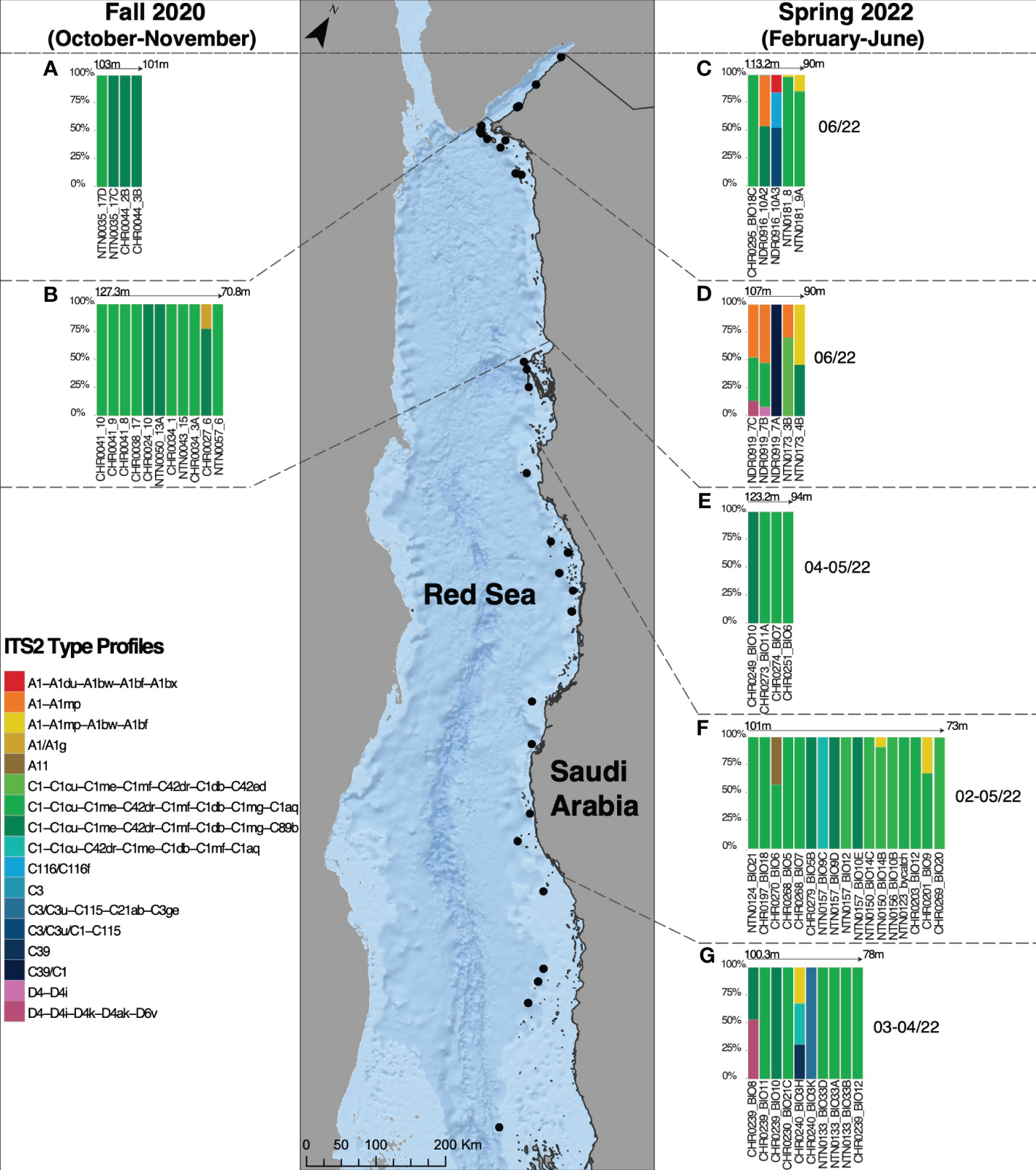 Symbiodiniaceae ITS2 type profiles in Leptoseris cf. striatus in the Gulf of Aqaba (A, C), in the North Red Sea (B, D), in Al Wajh (E), in the Central Red Sea (Yanbu and Thuwal) (F), and in the South Red Sea (G), found during two different sampling seasons, Fall 2020 (October-November) and Spring 2022 (February-June).