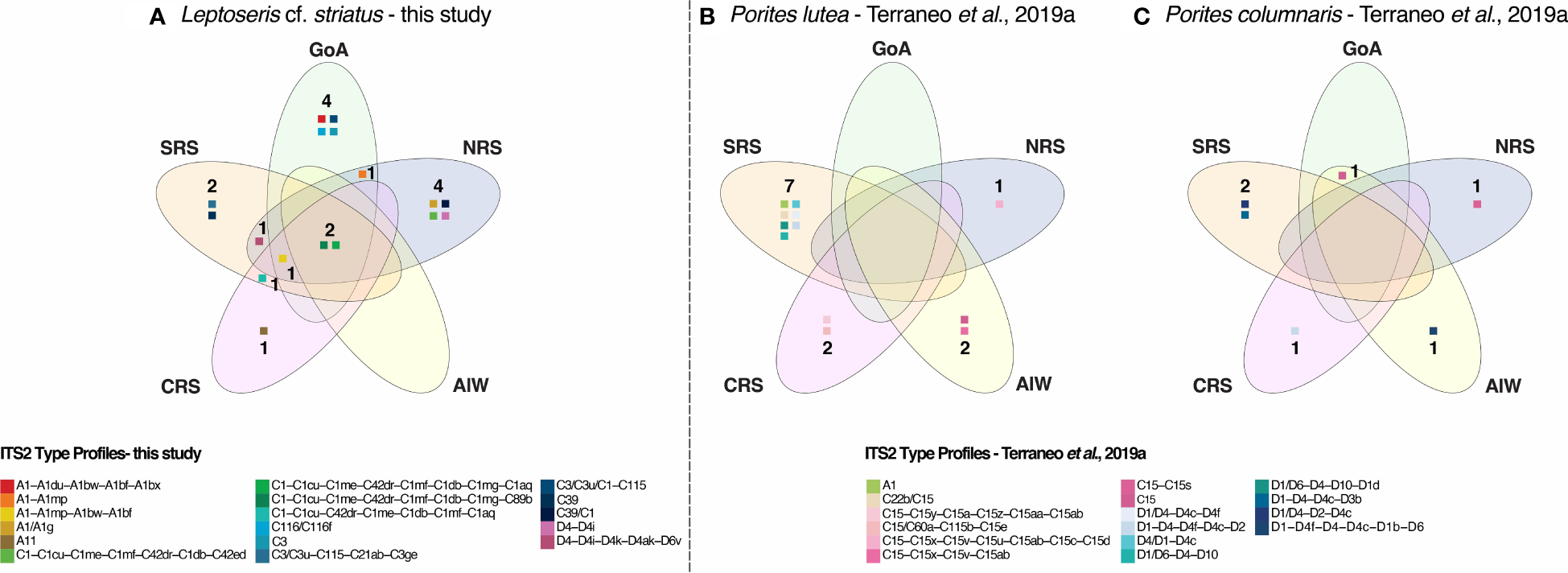 Venn diagrams comparing the unique and shared Symbiodiniaceae ITS2 type profiles of Leptoseris cf. striatus(A) from this study with the unique and shared Symbiodiniaceae ITS2 type profiles of Porites lutea(B) and Porites columnaris(C) from Terraneo etĀ al. (2019a).