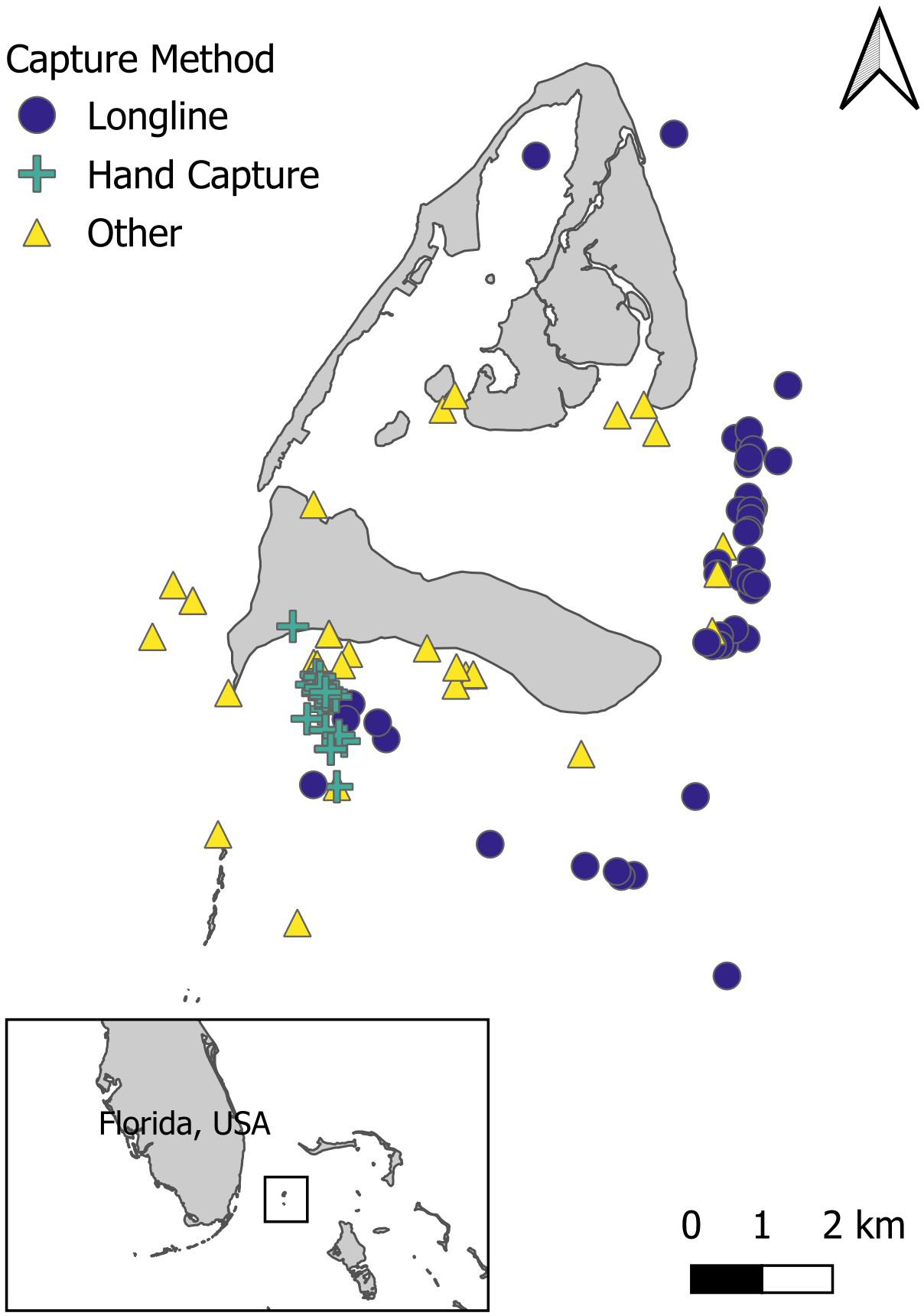 A total of 851 Ginglymostoma cirratum individuals (378 females, 458 males, and 15 sex not recorded) were caught between 2003–2020 in Bimini, The Bahamas (Table 2). There were 137 total individuals that were recaptured at least once for a recapture rate of 16.10%. Longline surveys and hand capture were the primary capture methods, and most individuals were caught on the east and south sides of the island (Table 2, Figure 1).