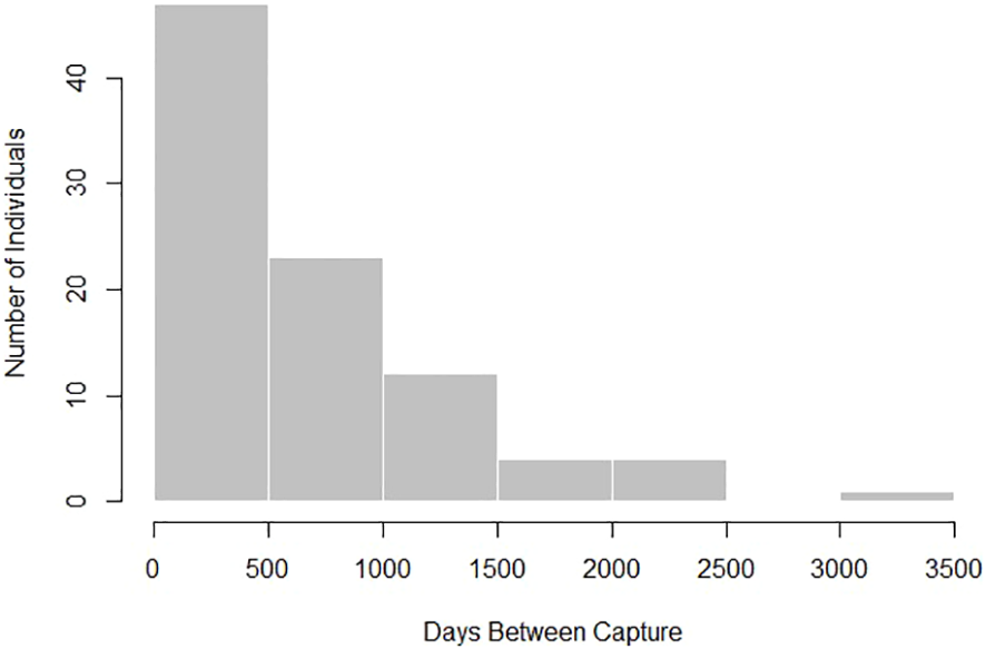 Distribution of days between first and last capture for Ginglymostoma cirratum recaptured ≥ 90 days apart near Bimini, The Bahamas.