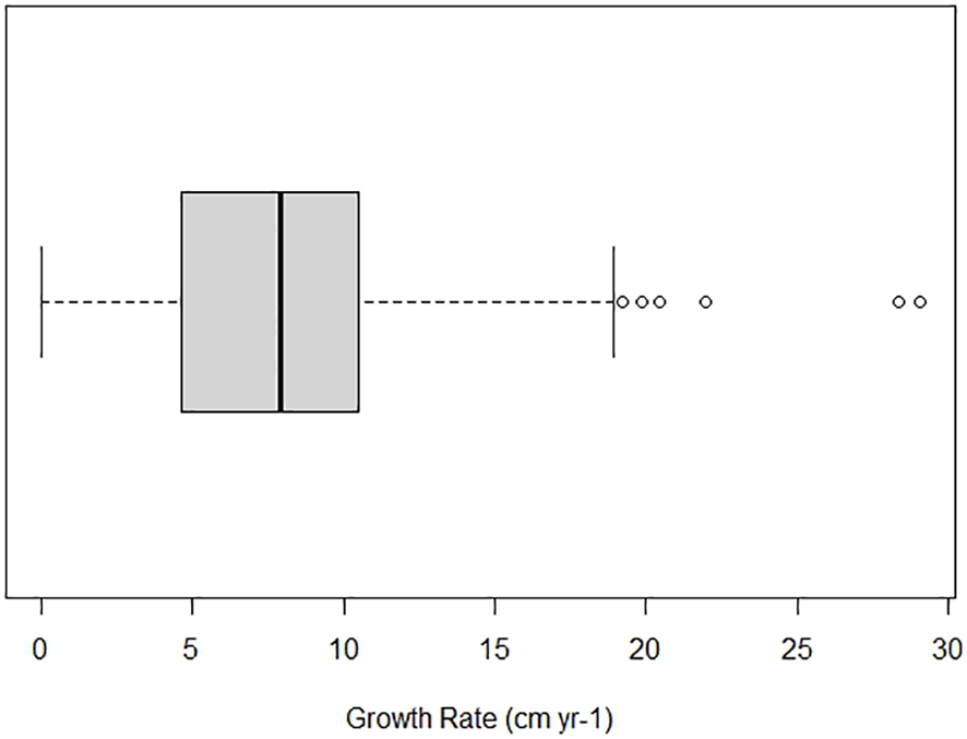 Annual total length (TL) growth rate of Ginglymostoma cirratum caught near Bimini, The Bahamas. The minimum value is 0 cm yr-1 while the maximum value is 18.91 cm yr-1. The first quartile is 4.65 cm yr-1 and the third quartile is 10.46 cm yr-1. The dark vertical line represents the median value at 7.88 cm yr-1.