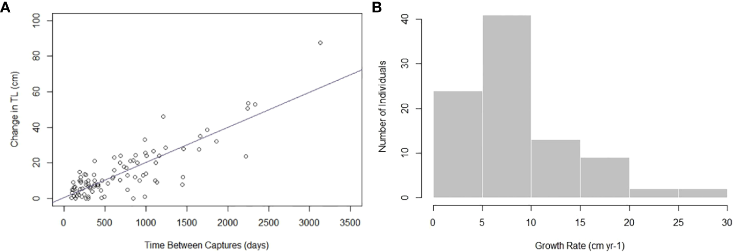 Ginglymostoma cirratum with captures ≥ 90 days apart were used for analysis to ensure sufficient time had passed between captures for notable growth to be detected and limit the influence of human measurement error (Simpfendorfer, 2000; Boggio-Pasqua et al., 2022). Individuals were represented in the analysis only once, despite if there were multiple recaptures, and the difference in TL and time between capture was determined based on first and last capture. We investigated the dataset for outliers and removed any recaptures with unrealistic observation error (e.g., negative growth). Separation of sexes was considered for data analysis, but given the already low sample size, sexual separation was avoided to prevent further reducing our dataset and due to no significant difference in the TLs between sexes (Supplementary Material).