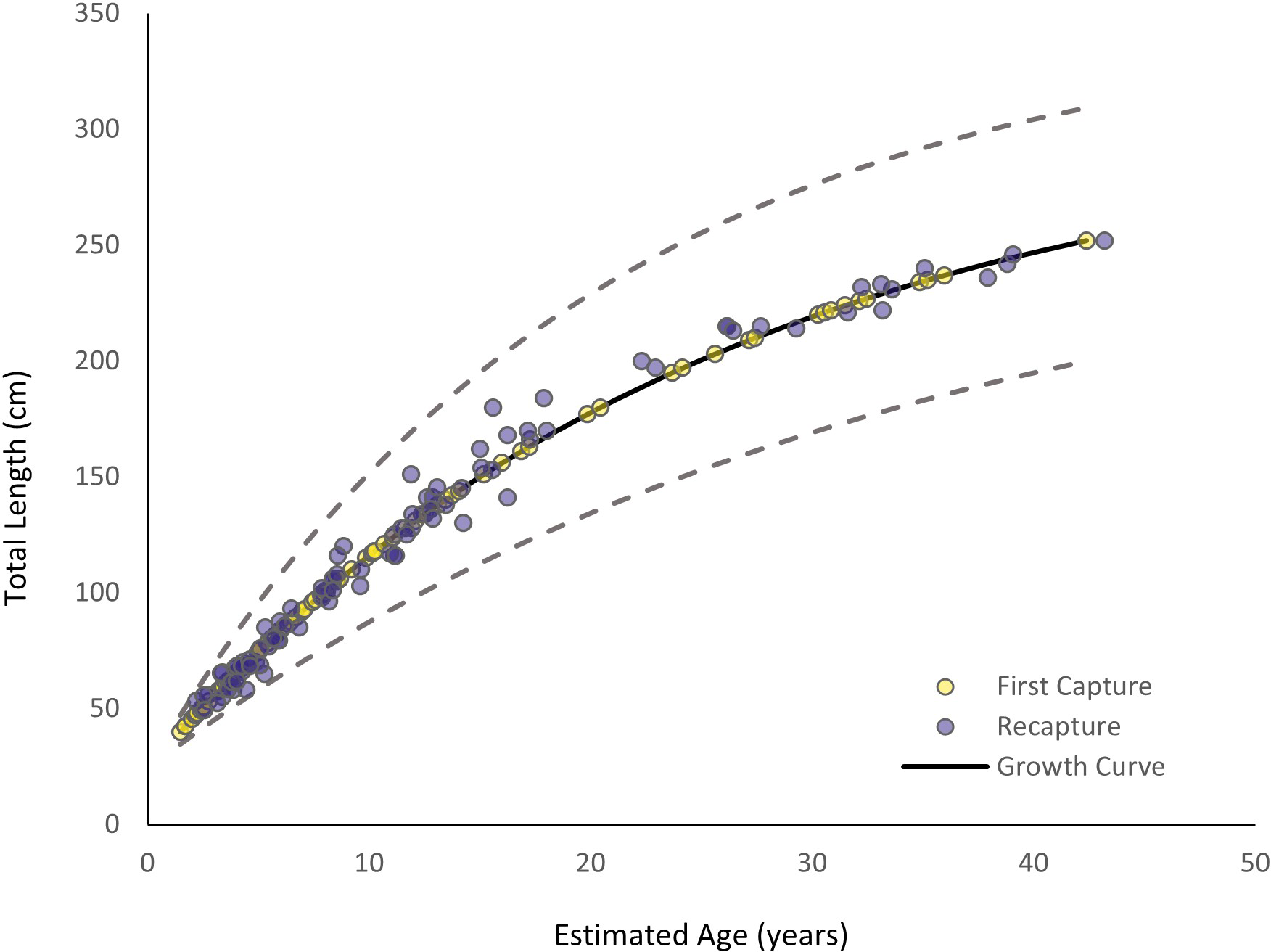 The previously published maximum lifespan for G. cirratum was 25 years (Clark, 1963), however, a recent study from the Dry Tortugas in the Florida Keys, USA, reported observations of the oldest individual in their population being ~ 43 years and still reproductively active (Pratt et al., 2022). Our vB estimates predict that the oldest individual in our study was 43 years old, thus supporting the age observation from Pratt et al. (2022). Age data can be inconsistent and unreliable for many elasmobranchs, so although the ages are estimates from this study, it will help contribute to a better overall understanding of G. cirratum life history (Rudd et al., 2019). Accurate maximum age estimation is a key component of population modeling and important for effective management of species (Loefer and Sedberry, 2003; Brooks et al., 2016). Castro (2000)’s reported lengths-at-maturity for G. cirratum suggest they could be 20-30 years old at maturity based on our vB growth curve. Further research on age and age at maturity in this species is needed to support this claim.