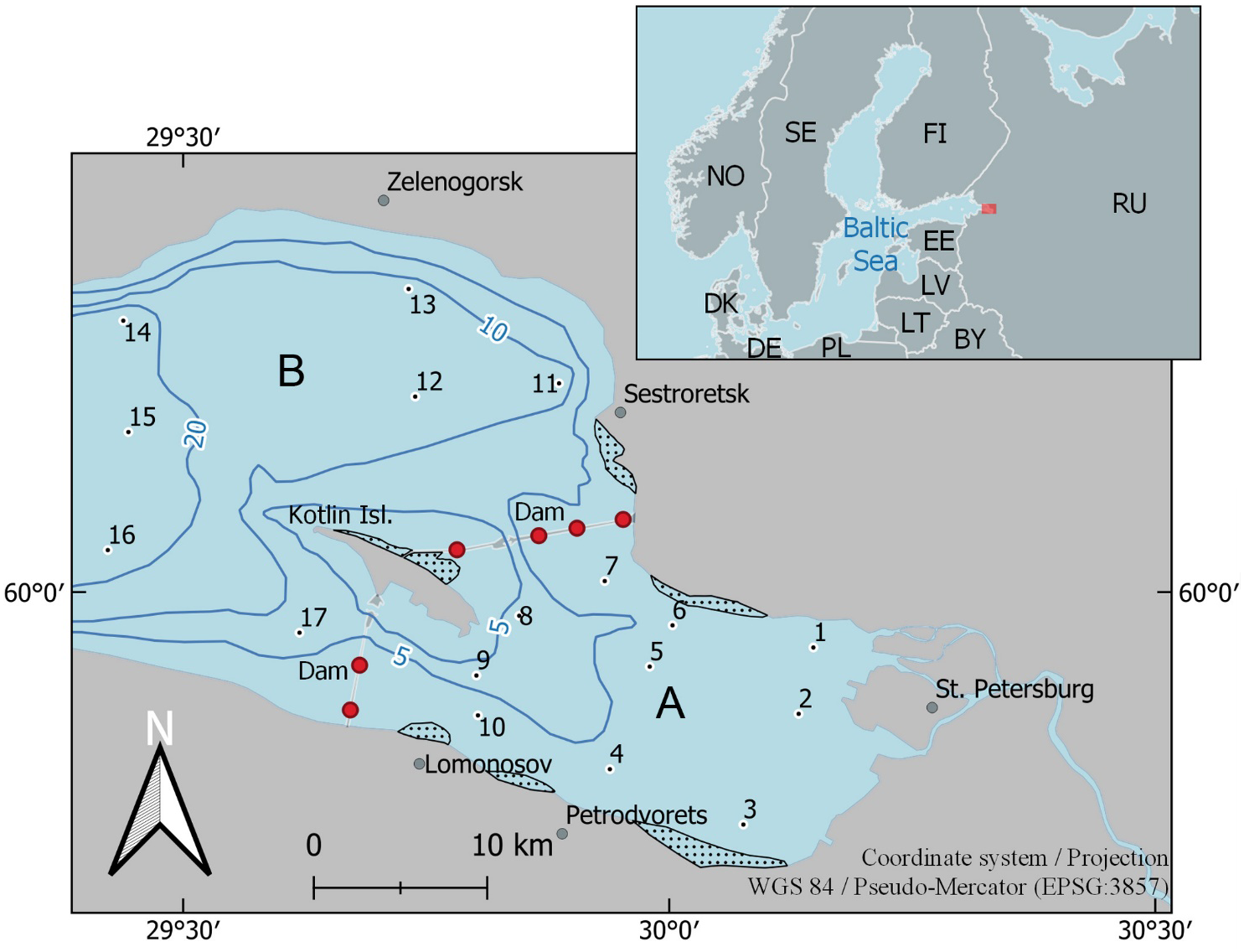The Neva Estuary (Figure 1) is located in the northeastern part of the Baltic Sea. It serves as the outlet for the Neva River, which originated from Lake Ladoga and flows into the Gulf of Finland. The Neva River has an average discharge of 2,490 m3 s−1 (78.6 km3 yr−1), and its catchment area spans over 280,000 km2 (Golubkov and Golubkov, 2020). Geographically, the estuary is located at the northern boundary of the temperate zone and at the southern boundary of the subpolar zone (Meteoblue, 2023). Climate type in the region is classified as Dfc — Snowy climate, fully humid, with cool summers according to Köppen-Geiger climate classification (Kottek et al., 2006).