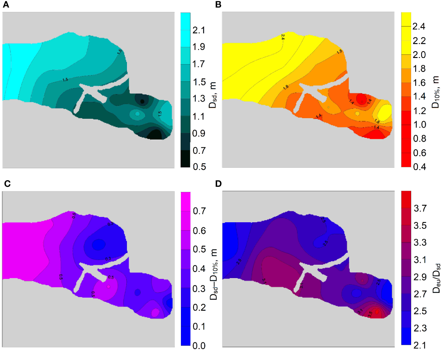 The lowest Deu/Dsd values around 2.0 were observed at concentrations of SMM< 1.4 g m−3 and SOM > 2.3 g m−3, while the D< 13 m, Dsd > 0.85 m, Deu< 3.5 m, and Dsd differed from the theoretical D10% less than 0.28 m (Figures 8A, B). These findings indicate that the calculation of Deu from Dsd values in estuaries using simple linear regressions is hardly justified, as real data can deviate significantly from theoretical predictions.