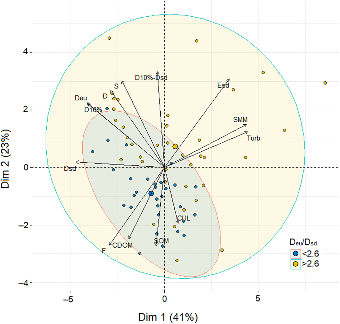 Results of principal component analysis of relationships between water transparency indices and environmental variables. All observation sites are ranked according to the Deu/Dsd ratio. Yellow dots are observation sites where Deu/Dsd was less than the median of the entire dataset (<2.6). Blue dots are observation sites where Deu/Dsd was greater than the median of the entire dataset (>2.6). The contours show the individuals (data points) distribution for each data set in which the Deu/Dsd ratio was greater than or less than 2.6. The large blue and yellow dots are the centers of the dispersion ellipses for each data set. The arrows show the vectors of changes in the indicators of the optical characteristics of water and environmental variables.