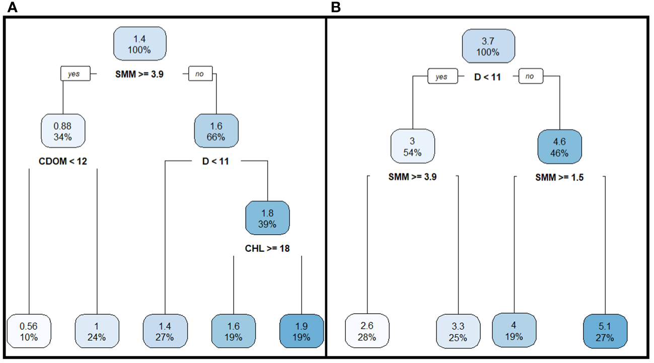 Regression trees were constructed using recursive partitioning of data based on analysis of variance (Breiman, 1984). CART is a prediction algorithm used in machine learning to predict outcomes based on predictor variables. The decision tree construction algorithm was performed from top to bottom by choosing a variable at each step that best splits the set of elements, which is the most commonly used method (Rokach and Maimon, 2005). It explains how the values of the target variable can be predicted based on other values. The goal of CART is to develop a sequence of partitioning rules to split response variable observations (i.e., Secchi disk depths) into relatively small, homogeneous groups of observations using related explanatory variable values. This is a decision tree where each fork is split into a predictor variable and each node at the end has a prediction for the target variable.