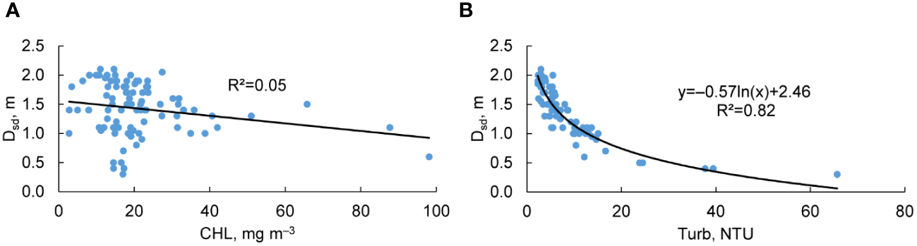 Preisendorfer (1986) formulated the “10 laws of the Secchi disk”, which encompass the conditions affecting the depth at which the disk disappears from the researcher`s view. However, interpreting Secchi disk measurements can still be challenging and yield contradictory results across different water areas (Harvey et al., 2019). For example, Dsd ceased to be a useful indicator of chlorophyll a concentration in a eutrophic reservoir when it exceeded 100 mg/m3, but was a good predictor of chlorophyll concentration below this threshold (Golubkov and Golubkov, 2024). To address this issue, various algorithms are being developed to derive Dsd from satellite data, aiming to interpret empirical data from diverse conditions in large-scale areas (Idris et al., 2022; Msusa et al., 2022; Roy and Das, 2022; Guo et al., 2022a). Nonetheless, field studies directly conducted on water bodies are still necessary to obtain empirical data from a variety of locations for further refinement of algorithms (Zhang et al., 2022).