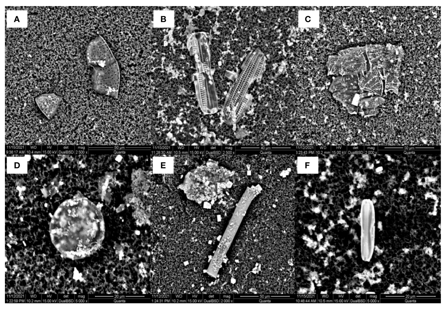 Planktonic remains and fragments. (A–C) Fragments of different diatom species from stations N30, N32, and N22, respectively. (D–F) More complete diatom remains of different species from stations N10, N32, and N32, respectively.