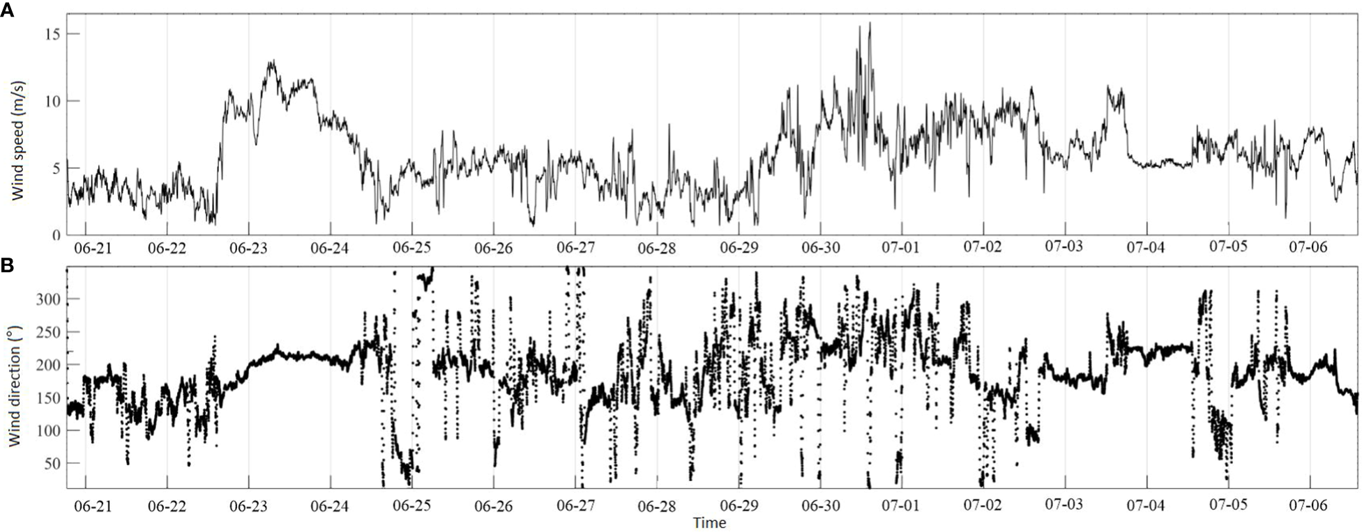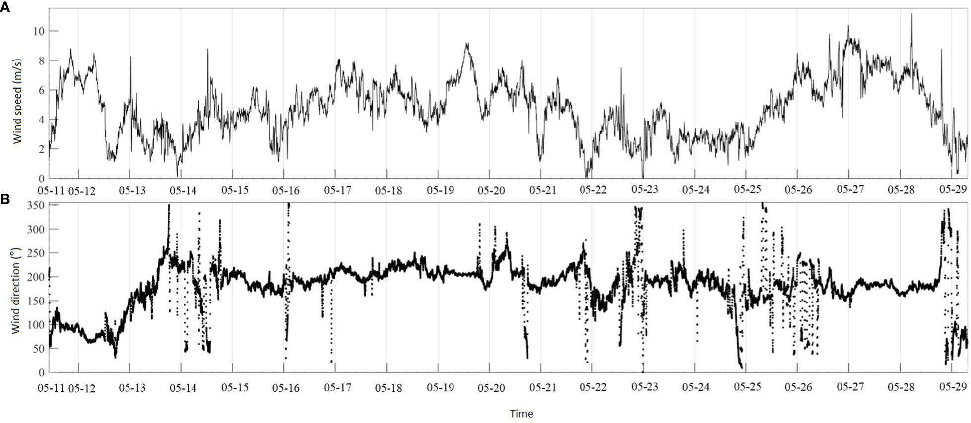 Wind speed (A) and direction (B) in the ZGA area during the transition of spring-summer monsoon in 2020.