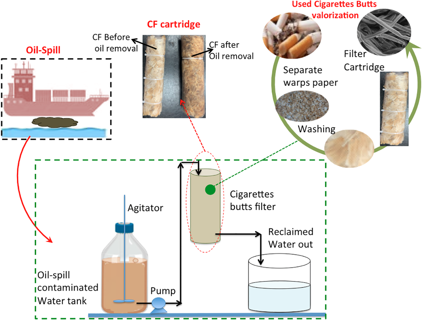 oil spill clean-up, filtration, cellulose acetate, cigarette butt valorization, adsorption