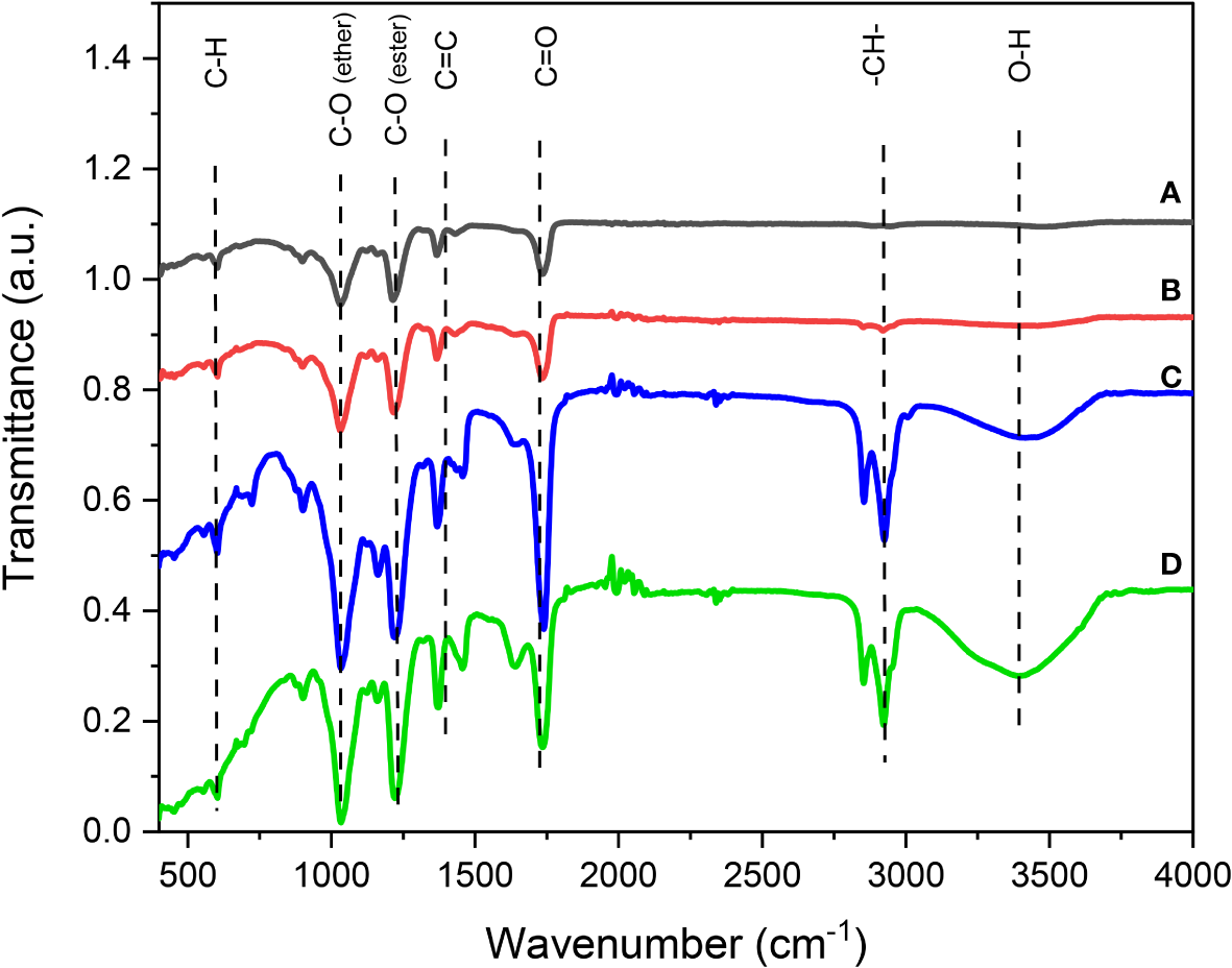 Fourier transform infrared (FTIR) spectra of the cigarette butts: clean cigarette butts (A) washed cigarette butts (B) cigarette butts saturated with castor oil (C) and cigarette butts saturated with spilled oil (D).
