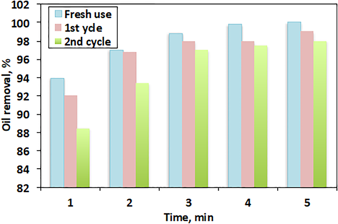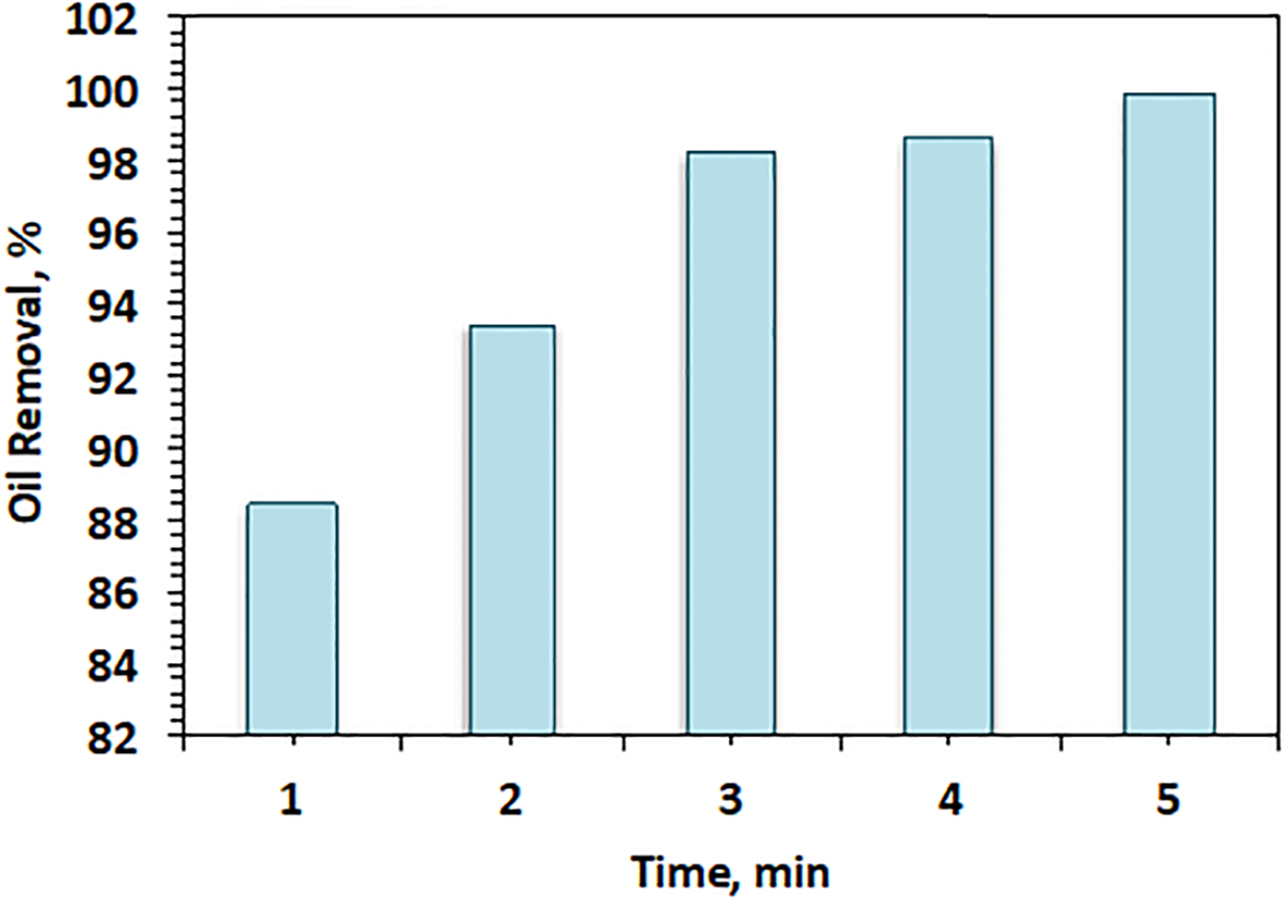 In order to determine the sorption time for maximum oil uptake, it is essential to investigate the optimal oil uptake time. In this regard, oil removal was studied as a function of contact time. The results are presented in Figure 5. The results revealed that oil separation increased with the increase in contact time between the filter medium and the oil molecules. It is also observed from the data in Figure 5 that the time increase resulted in better oil removal efficiency. It is indicated that the oil removed reached 99% when the contact time reached 5 min. However, it was only 88% when the contact time was 1 min. Interestingly, the pore structure of the filter butts helped with oil adhesion on the surface of the filter material (Tayeb et al., 2019; Cai et al., 2021).