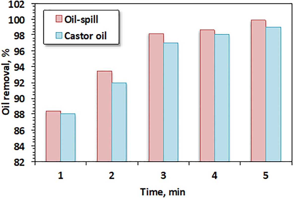 The prepared CB filter was further examined for use in the separation of different oil types. The data are presented in Figure 6. The studied oil types included castor oil as a synthetic wastewater model and oil spill as a real polluted wastewater sample. It is obvious from the results that the initial removal was 88% for castor oil compared to 88.4% for oil spill (Poorsargol et al., 2020). However, the final removal reached 99% and 99.8% for castor oil and oil spill, respectively. It is suggested that CBs possess a number of functional groups that might support the adsorption process. Furthermore, the spongy structure of CBs might have helped the absorption process to occur. According to the FTIR results displayed in Figure 3, the presence of the COOH groups in CBs not only provides a strong affinity to the CB substrate but also delivers more active sites for oil capture. Since the cellulose acetate in CBs hydrolyzed in the aqueous phase, the CBs were converted into cellulose and acetic acid. Thus, the OH group appeared in the sample. Therefore, the OH group was augmented with the C=O group and COOH was obtained, which helped improve the adsorption tendency. The COOH groups formed in the medium helped improve the hydrophobicity of the cellulose acetate fiber substance, thus promoting the interaction of oil in water with the substance. In addition, hydrogen bonding and the electrostatic interaction of oil with the COOH groups drive the adsorption of oil (Poorsargol et al., 2020).