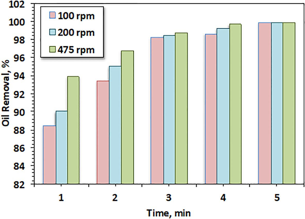 The effect of the agitation speed of oily wastewater on the filtration efficiency of such oil was examined at 100–475 rpm at a sorption time of 1–5 min. In this regard, the data displayed in Figure 7 demonstrate that the increase in agitation speed enhanced the efficiency of oil removal from 80% in the first minute, reaching 93%. This verified that an increase in mixing speed enhanced the rate of mass transfer, leading to a lessening in surface film resistance, thus allowing residual oil to be easily spread on the surface of the CBs (Lin and Liu, 2000). Furthermore, it could be confirmed that the solution contaminated with oil became very turbulent and erratic in nature, resulting in the transfer of oil into the filter material.