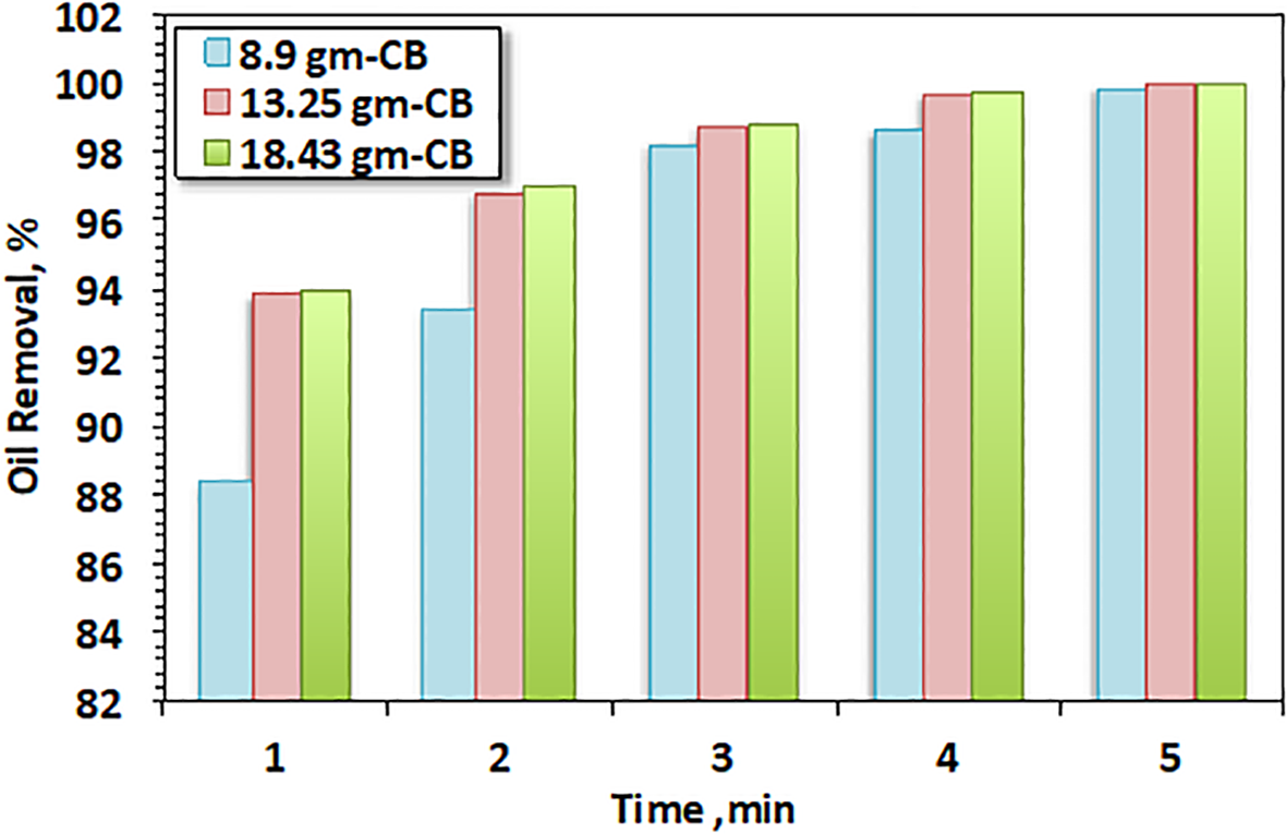 To further understand the filtration and oil sorption technique with the modified oil filter, the filter weight and thickness comparison data were assessed. This effect was investigated by taking three different weights at constant initial oil concentration and recording the separation time through the use of different filter doses. In Figure 8, it is clearly observed that the removal rate was enhanced with the increase in CB weight from 8.9, 3.25, and 18.43 g through the increase in the separation and adsorption time. This phenomenon was clear at the minimum time (1 min) of separation. In addition, by increasing the filter bed dose, the removal efficiency also increased, but the removal rate later almost reached a constant value with the increase in time. The filter media was saturated with the oil even at a higher weight, which might account for this (Tehrim et al., 2021). This might have been due to the fact that the porosity of the surface helps capture the oil where the pores increase the strength of the sorption mechanism through increasing the effective forces between the oil molecules on the surface of the CBs.