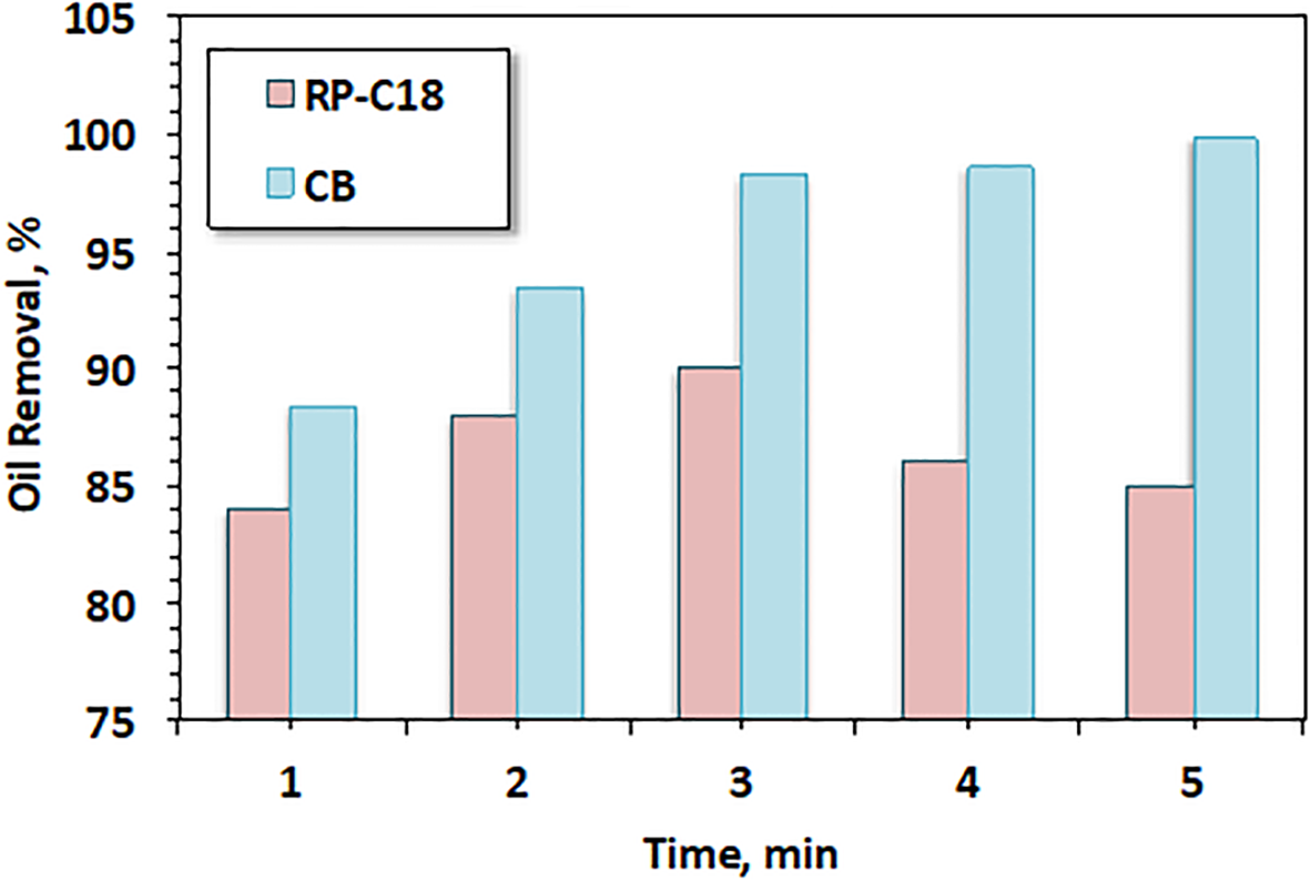 The percentage of oil removal ranged from 84% to 90%, with an increase in contact time from 1 to 3 min. This removal efficiency was attributed to the sorption capacity of the synthetic sorbent. This was most likely due to the fact that, at minimum contact time, oil removal occurred only on the outer surface of the synthetic fiber. However, by increasing the contact time, the sorbent material became more saturated with oil and, therefore, sorption took place through the interior bulk of the material. The cartridge material was more fibrous and fluffy than the outer surface. Subsequently, there was more oil sorbed with the time of contact (Tayeb et al., 2019). Furthermore, for comparison, according to the results in Figure 10, the cellulose acetate from the CB filter showed a pronounced effect compared to the commercial RP-C18 material. The removal efficiency of oil spill when the CB filter was used could reach 99%, but was 90% when the commercial adsorbent (RP-C18) was used. These results confirm the significance of the developed filter from waste material.