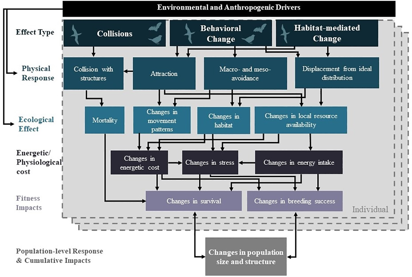Conceptual framework for understanding potential effects of offshore wind energy development on birds and bats (modified from (Fox et al., 2006). Symbols in the “Effect Type” section of the diagram indicate applicability to marine birds, diurnal and nocturnal avian migrants, and bats. Effects include collisions, behavioral change, and habitat-mediated change, each of which may cause one or more physical responses by birds or bats that in turn result in ecological, energetic/physiological, and fitness effects on individuals. These individual-level effects can then be scaled up to understand the potential for population-level or cumulative response. Ecological drivers (e.g., environmental variability, resource distributions) and anthropogenic drivers (e.g., OWED turbine size and spacing) can influence and introduce variability into physical response, as well as effects.