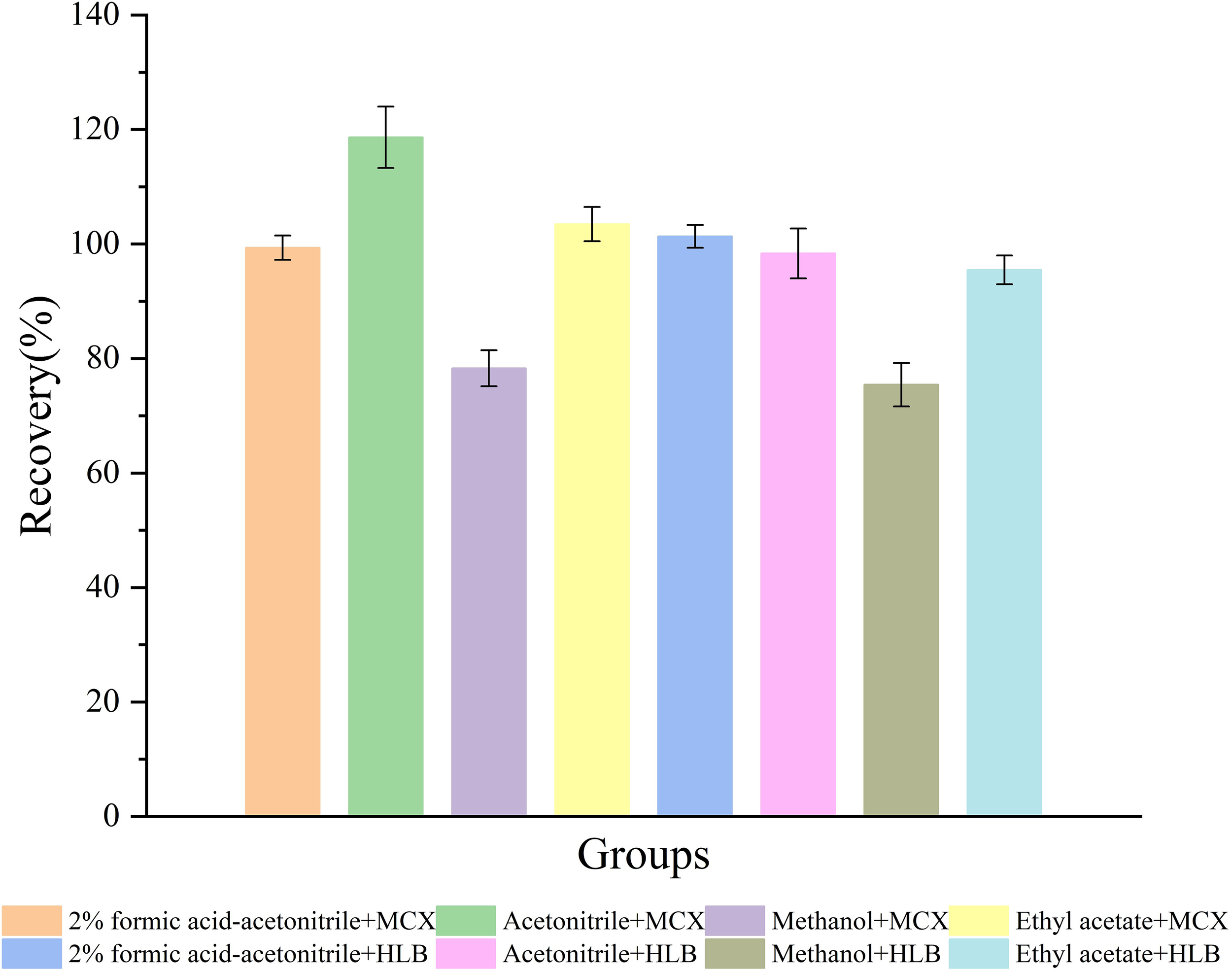 Recoveries of TML by different extraction columns (Oasis MCX SPE and Oasis HLB SPE columns) and extraction solvents (2% formic acid-acetonitrile, acetonitrile, methanol, and ethyl acetate) in fish samples spiked at 50 ng mL-1.