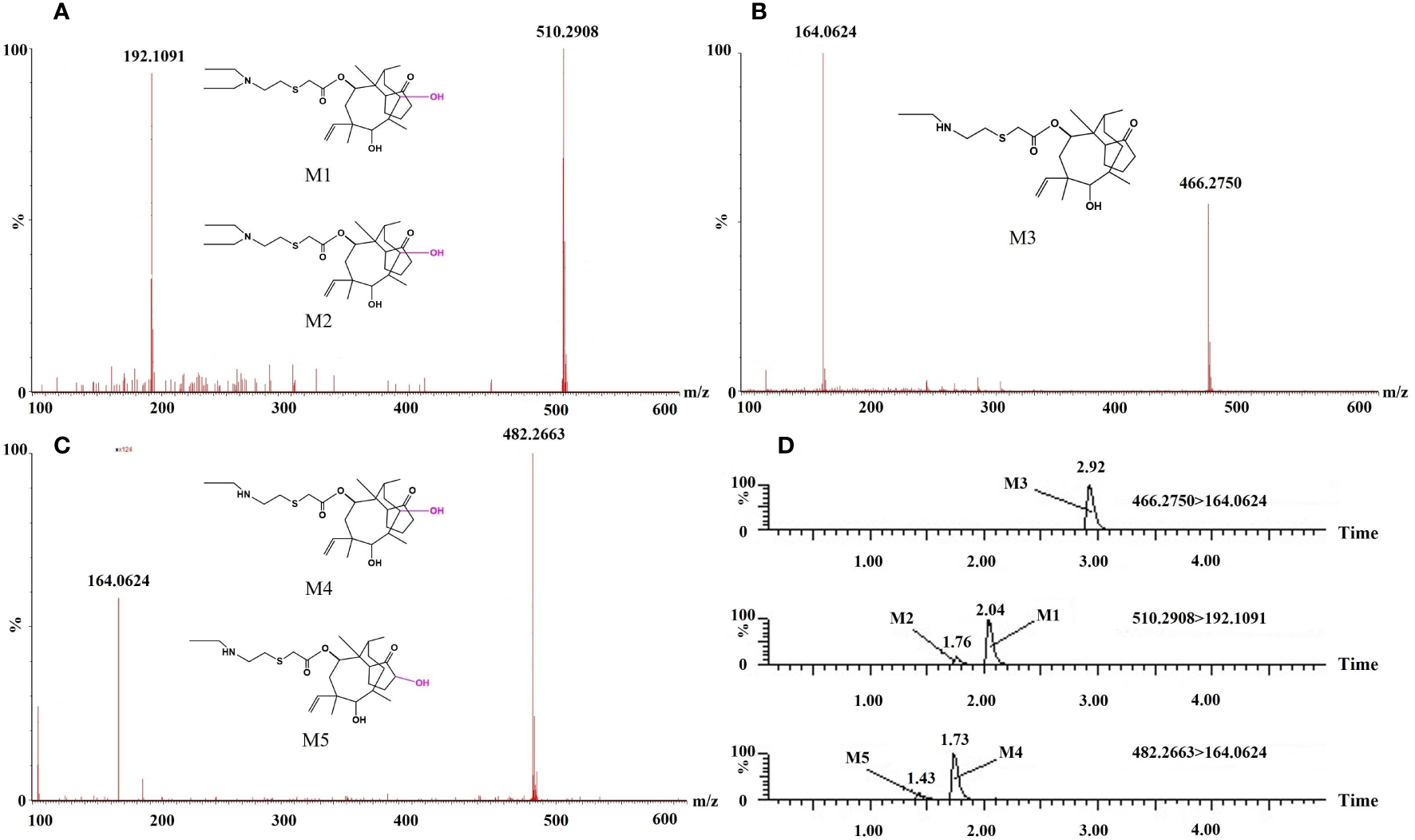 Mass spectra (A–C) and chromatograms (D) of the five tiamulin metabolites in Crucian carp tissues.