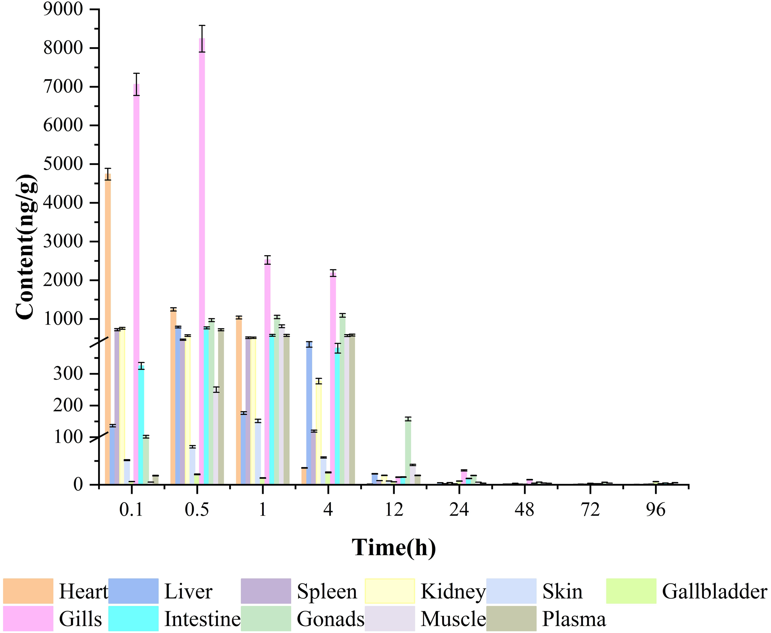 The tissue-specific distribution of TML in crucian carp are shown in Figure 3. TML distribution in the collected tissues (heart, liver, spleen, kidney, skin, gallbladder, gill, intestine, gonads, muscle, and plasma) was significantly different. The highest TML concentrations were found in the gills at 0.5 h but were not detected in the skin and gall bladder. TML concentration showed an initial increase, followed by a decreasing trend in all tissues except the heart (Yang et al., 2022).