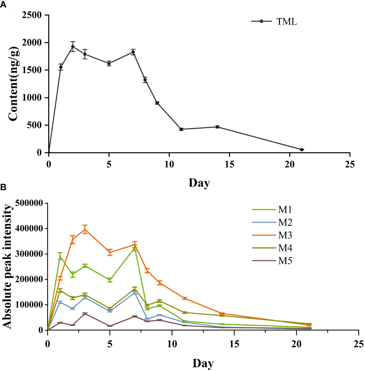 Concentration-time curves of TML (A) and peak areas of extraction chromatograms of TML metabolites (B) detected in in vivo of Crucian carp..