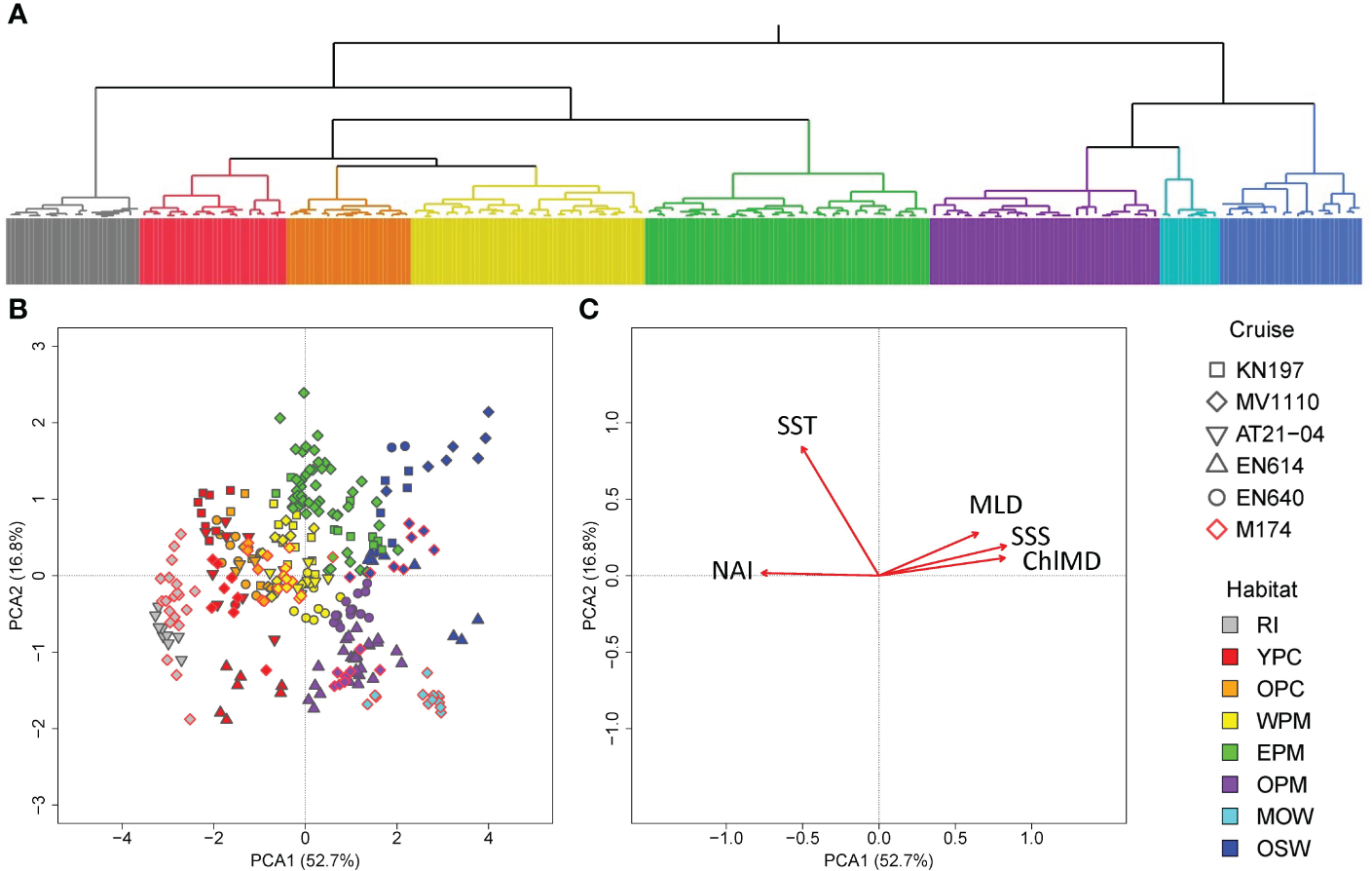 Wards-mean hierarchical cluster analysis (A) and principal component analysis (B, C) of CTD casts from six cruises conducted in the WTNA based on the habitat-defining variables of Weber et al. (Weber et al., 2019). (A) Dendrogram showing clustering of different groups, where colors correspond to habitat types. The detailed classification of each cast can be found in the supplementary. (B) Scatter plot of each cast’s score with respect to the first two principal components, where colors correspond to habitat types, and marker shapes correspond to cruises. (C) Loading plot showing the unrotated loading matrix of the analyzed habitat-defining variables as a function of the first two principal components. The closer the variable’s loading value is to 1 or -1, the greater the effect of the variable in driving that component. Habitat types are marked by color: riverine input (RI, gray), young plume core (YPC, red), old plume core (OPC, orange), western plume margin (WPM, yellow), eastern plume margin (EPM, green), outer plume margin (OPM, purple), modified oceanic water (MOW, cyan), and oceanic water (OSW, blue).