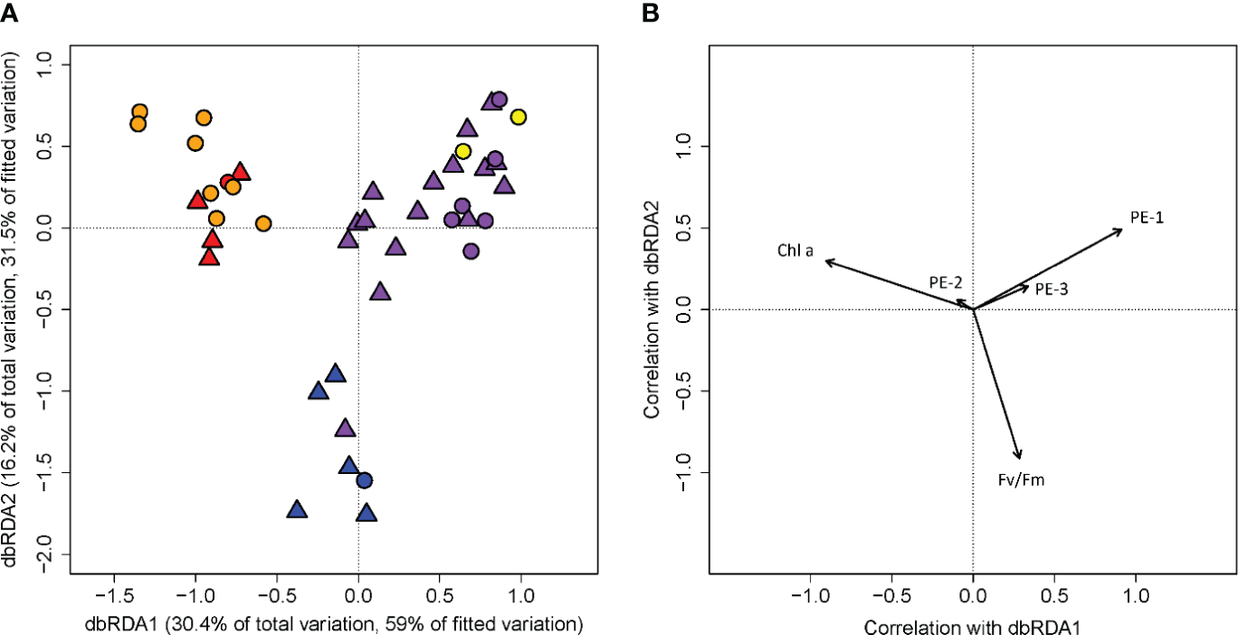 For in vivo fluorescence measured with the ALF, the dbRDA model fitted by our habitat assignment returned an R2 value of 0.51 and the permutation test returned a p-value of 0.001 (Supplementary Tables 9 and 10). The first two dbRDA axes explained 46.6% of the total observed variation and 90.5% of the variation when constrained by habitat types (Figure 3), with the first axis dbRDA1 alone accounting for 30.4% and 59% of the total and the constrained variation, and the second axis dbRDA2 accounted for 16.2% and 31.5% of the total and constrained variation. Both the pairwise PERMANOVA and the ANOVA-like comparison on the dbRDA showed significant differences among the plume core (YPC and OPC), plume margin (OPM), and oceanic water (OSW) phytoplanktonic communities (Supplementary Tables 6 and 9). On the dbRDA plane of the first two axes, the first axis, negatively correlated with chlorophyll, mainly separated the plume core (YPC and OPC) communities from the plume margin (WPM and OPM) communities. The second axis, negatively correlated with Fv/Fm, discriminated the oceanic water communities (OSW) from the rest. PE-1 correlated positively with both dbRDA1 and dbRDA2. PE-3 showed a weaker correlation in the same direction as PE-1. PE-2 showed negative correlation with the third axis dbRDA3, which contributed only 3.8% and 7.4% to the total and the constrained variation, mainly separating the YPC and some OPM stations from the rest (Supplementary Figure 3).