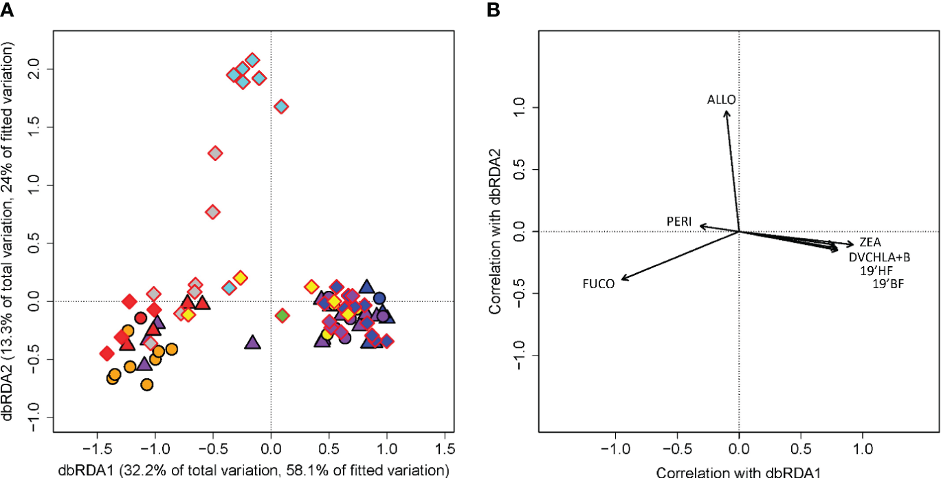 Since PERMANOVA tests for cell counts, diagnostic pigments, and fluorescence all showed significant differences (p< 0.001, Supplementary Tables 6–8) among habitats, distance-based redundancy analyses (dbRDA) were conducted using the “capscale” function to further examine the phytoplankton beta diversity among different habitat types. DbRDA is a multivariate constrained ordination method to explore the relationships among biological assemblages of species and their environments (Legendre and Anderson, 1999). We examined the data structure by doing eigen-analyses of the biodiversity distance matrices fitted by the predictor variable, which is the habitat assignment in this case (Anderson et al., 2008). The Pearson’s correlation of the standardized phytoplankton measurements with their respective axes was used to identify the individual pigments, fluorescence signals, or phytoplankton species that accounted for the differences observed among habitats. ANOVA-like permutation tests based on 999 permutations were performed to assess the significance of the model for all analyses (Legendre et al., 2011). While PERMANOVA can test for the biological relevance of the superimposed habitat types on the overall observed variation in the phytoplankton data, dbRDA and its subsequent tests allow us to examine the influence of the habitat assignment on the overall variation and explore trends that would be masked by the high variability or high correlation in the unconstrained ordination. Since all tests were significant (p< 0.001, Supplementary Tables 9–11), we conducted subsequent pairwise permutation tests among all the habitat types in the dbRDA to further confirm their biological significance (Kindt and Coe, 2005).