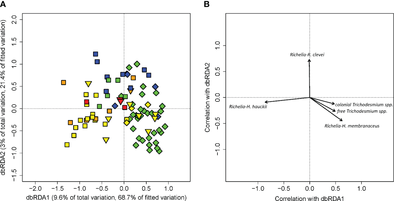 DbRDA of diazotroph cell count data from cruises KN197, MV1110 and AT21-04 (R2 = 0.14, p=0.001). Panel (A) is a scatter plot of each score with respect to the first two axes of the dbRDA. Percentages of variation explained by dbRDA1 and dbRDA2 in the habitat-type fitted model and in the total observed variation are listed on their respective axes. Each marker corresponds to a phytoplankton composition from one single cast. Panel (B) is a biplot with arrows displaying the Pearson correlations of phytoplankton species with the first two dbRDA axes. The length and direction of the arrows indicates the correlation of the species with the respective dbRDA axis. Marker shapes indicate the cruise each profile was collected as in Figure 1. Habitat types are marked by color: riverine input (RI, gray), young plume core (YPC, red), old plume core (OPC, orange), western plume margin (WPM, yellow), eastern plume margin (EPM, green), outer plume margin (OPM, purple), modified oceanic water (MOW, cyan), and oceanic water (OSW, blue).