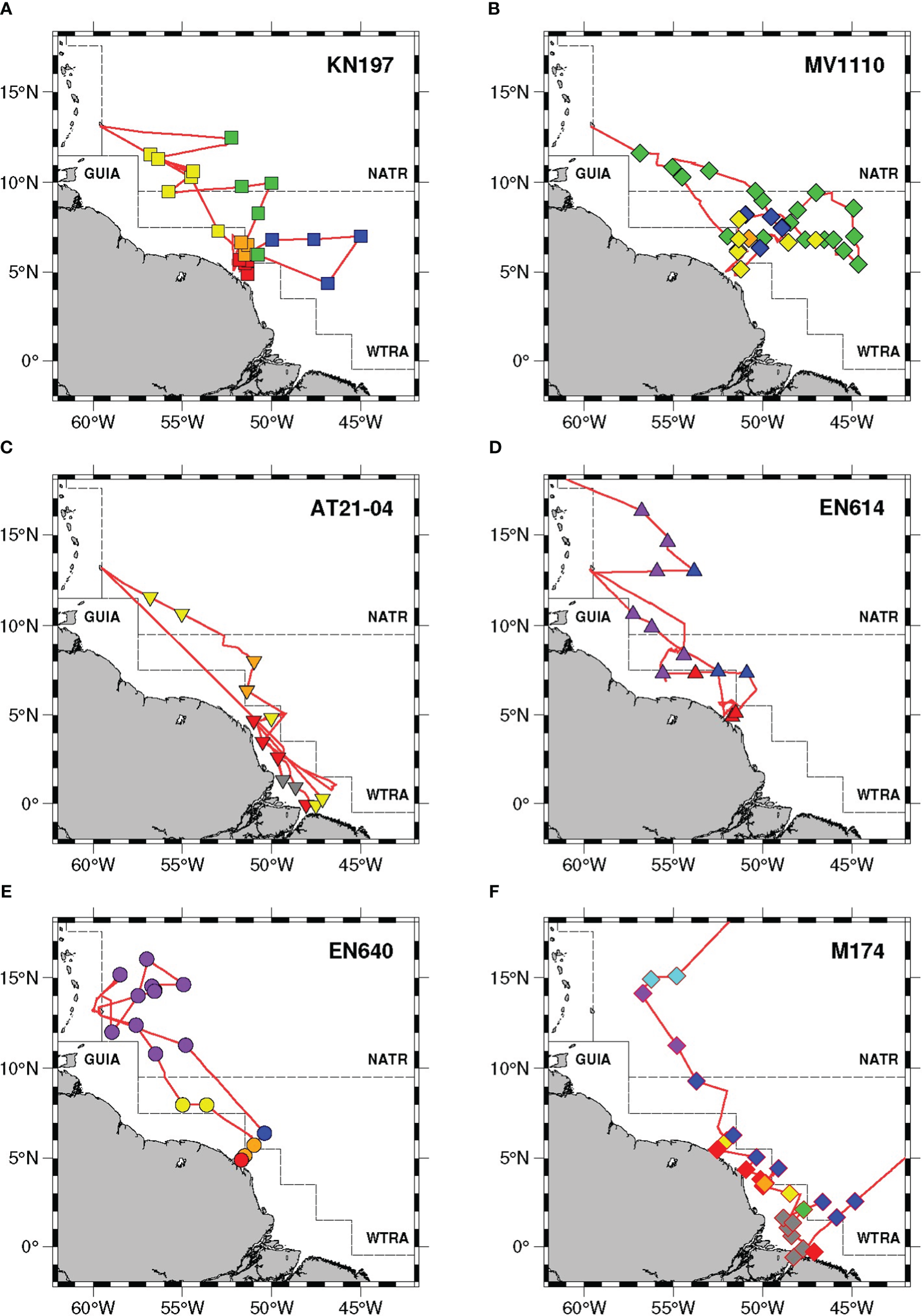 Station map of the six cruises studied (A–F) where each marker denotes a single station. Marker shapes denote the different cruises as in Figure 1. Marker colors show the most common habitat type assigned for the casts of each station: riverine input (RI, gray), young plume core (YPC, red), old plume core (OPC, orange), western plume margin (WPM, yellow), eastern plume margin (EPM, green), outer plume margin (OPM, purple), modified oceanic water (MOW, cyan), and oceanic water (OSW, blue). The red lines denote the individual cruise track. The black dashed lines denote the boundaries of Longhurst’s biogeochemical provinces: North Atlantic tropical gyral (NATR), Western Tropical Atlantic (WTRA), and Guianas coast (GUIA). Habitat types are marked by color: riverine input (RI, gray), young plume core (YPC, red), old plume core (OPC, orange), western plume margin (WPM, yellow), eastern plume margin (EPM, green), outer plume margin (OPM, purple), modified oceanic water (MOW, cyan), and oceanic water (OSW, blue).