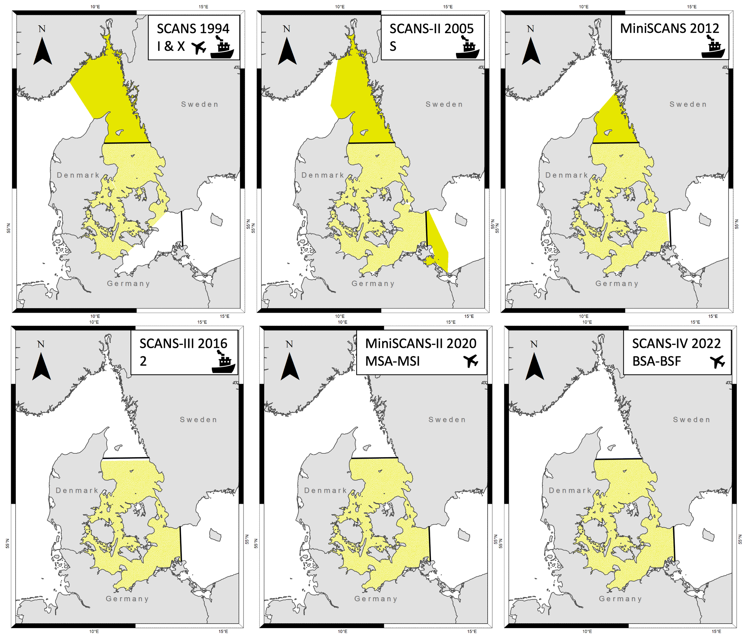 Survey area coverage of the individual SCANS (1994, 2005, 2016, 2022) and MiniSCANS surveys (2012, 2020) surveys is shown in yellow, and the defined management area of the Belt Sea population of harbour porpoises (Phocoena phocoena) in solid black lines (with the limits defined in Sveegaard et al., 2015). Shading is light yellow when survey area is inside the management area, and dark yellow when outside. The 1994 survey was excluded from the trend analysis due to the lack of coverage in the south-eastern part of the management area. Labels in top left indicate survey name, survey year and which blocks were designed (note that in 2012 a single survey area without any stratification in blocks was planned); the icon represents the survey platform. Figure modified from Gilles et al., 2023.
