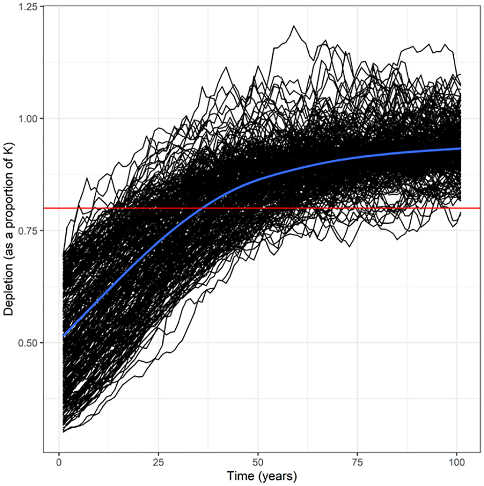 Populations dynamics of the Belt Sea population of harbour porpoise (Phocoena phocoena) under the base case scenario (0A-assuming a Maximum Net Productivity Level (MNPL) of 0.5, population growth rate (Rmax) of 4%, coefficient of variation of the abundance estimate of 0.2, and no bias in other factors) (n = 302 simulations) with a recovery factor of 0.1. The mean of the trajectories is shown by the blue line. The 80% of carrying capacity (K) depletion level is shown by the red line, which is consistent with the conservation objective of ASCOBANS.