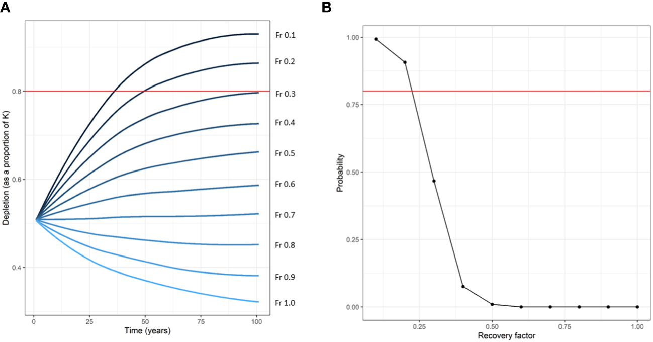The Potential Biological Removal (PBR) control rule was developed within a management strategy framework: the amended Marine Mammal Protection Act (MMPA) in the USA. A set of legally-binding guidelines were made to compute a limit reference point for anthropogenic removals from marine mammal stocks (or management units). PBR does not require information on bycatch level or other human-caused mortality, instead it relies on an absolute abundance estimate (and precision) to determine a removal threshold (aka reference point) above which removals would prevent a population/management unit from reaching a defined conservation objective (Wade, 1998; Wade et al., 2021). In the case of the MMPA, meeting the conservation objective is defined on two criteria; 1) that a population at the maximum net productivity level [MNPL, greater than or equal to 50% of carrying capacity (K)] is able to remain there for 20 years (short-term goal), and 2) that a population that is depleted at 30% of K is able, despite non-nil removals, to reach and remain above MNPL within 100 years with a probability of 0.95 (long-term goal; see ‘conservation goals’ in Wade, 1998, page 8). The PBR control is enshrined in the U.S. MMPA but has been applied to a range of cetacean species around the world (Slooten et al., 2006; Stenson et al., 2012; Parra et al., 2021) thereby accepting, either implicitly or explicitly, the U.S. MMPA conservation objective.