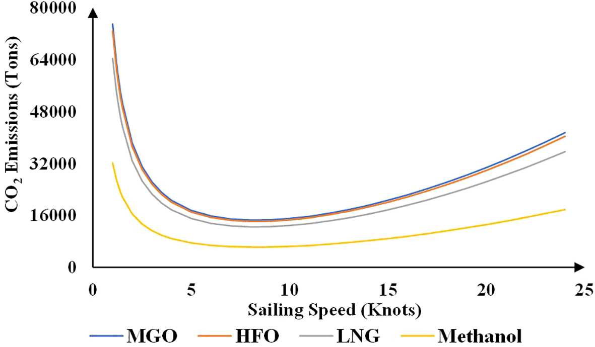 Assumption 1: As the relationship between fuel consumption and ship speed is exponential (Goicoechea and Abadie, 2021), it is assumed that fuel consumption of the main engine is proportional to the sailing speed to the power of α (Cariou and Cheaitou, 2012;Du et al., 2019), and is independent of the fuel type used by ships (Fan et al., 2020).