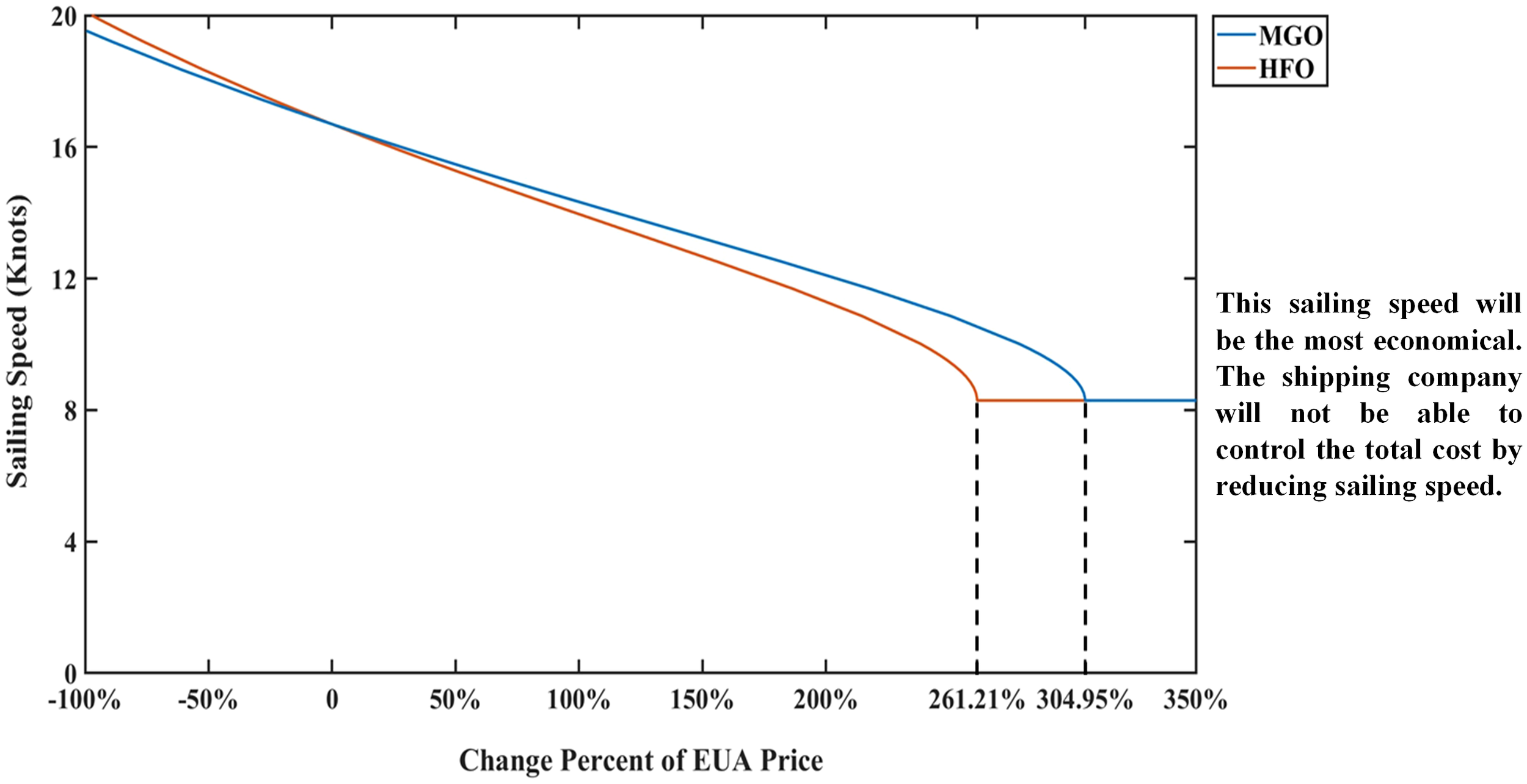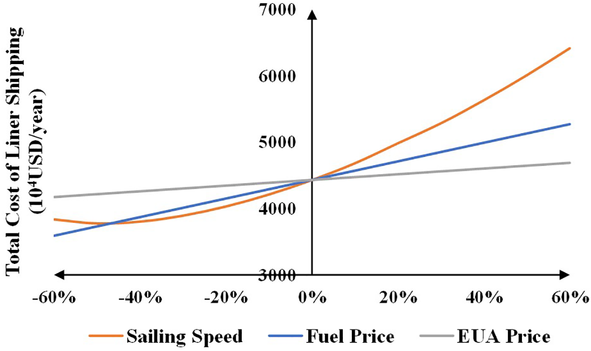 Liner shipping is a prominent source of CO2 emissions from maritime transport, with containerships being often the main type of ships providing these services. Compared to other ship types such as bulk carriers and oil tankers, containerships typically operate at higher speed (Svindland, 2018), leading to greater fuel consumption and CO2 emissions (Kokosalakis et al., 2021). Moreover, the sailing speed of a containership has a substantial impact on its total cost (Wang and Meng, 2012). The sailing speed affects fuel consumption, thus affecting fuel cost, which accounts for over 50% and sometimes even 75% of the total cost of a ship (Zheng et al., 2021). Under the EU ETS, the sailing speed of liner shipping will affect its EUA cost by affecting EU-related CO2 emissions.