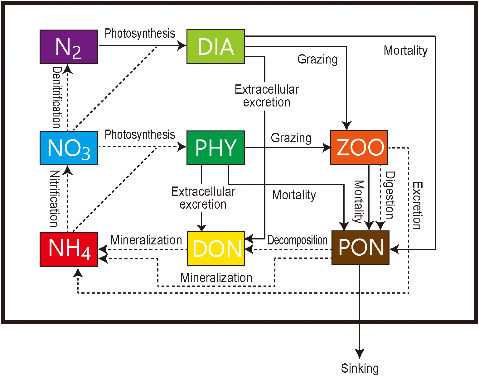 Schematic of the marine ecosystem isotope model. NO3−, nitrate concentration; NH4+, ammonium; N2, dinitrogen; PHY, phytoplankton; DIA, diazotrophs; ZOO, zooplankton; PON, particulate organic nitrogen; DON, dissolved organic nitrogen. Dashed and solid arrows indicate nitrogen flows with and without isotopic fractionation, respectively.