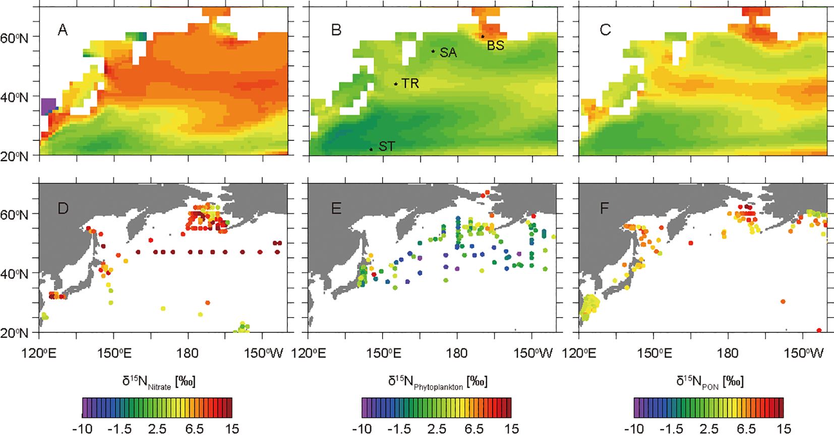 The variations in δ15N values reflect biogeochemical processes. When phytoplankton assimilates nitrate, nitrogen isotopes are fractionated (Wada and Hattori, 1978; Montoya and McCarthy, 1995). The δ15N value of nitrate (δ15NNitrate) increases as nitrate consumption increases due to an isotopic effect ranging from 5‰ to 8‰ during nitrate assimilation by phytoplankton (Granger et al., 2010). When denitrification occurs in the water column, the δ15NNitrate value increases dramatically due to a strong isotopic effect of ~15‰ (Granger et al., 2008). N2-fixation produces fixed nitrogen with a δ15N value of ~0‰, because nitrogen fixers take up N2 with little isotopic effect (Minagawa and Wada, 1986). This fixed nitrogen with a low δ15N value is eventually converted into nitrate with a low δ15N value through the degradation of nitrogenous organic compounds via remineralization and subsequent nitrification. The spatial patterns of δ15NNitrate values in the euphotic zone are conserved in phytoplankton and are subsequently transferred to organisms with higher trophic positions (zooplankton and fish) with 15N enrichment of ~3‰ per trophic position (Minagawa and Wada, 1984).