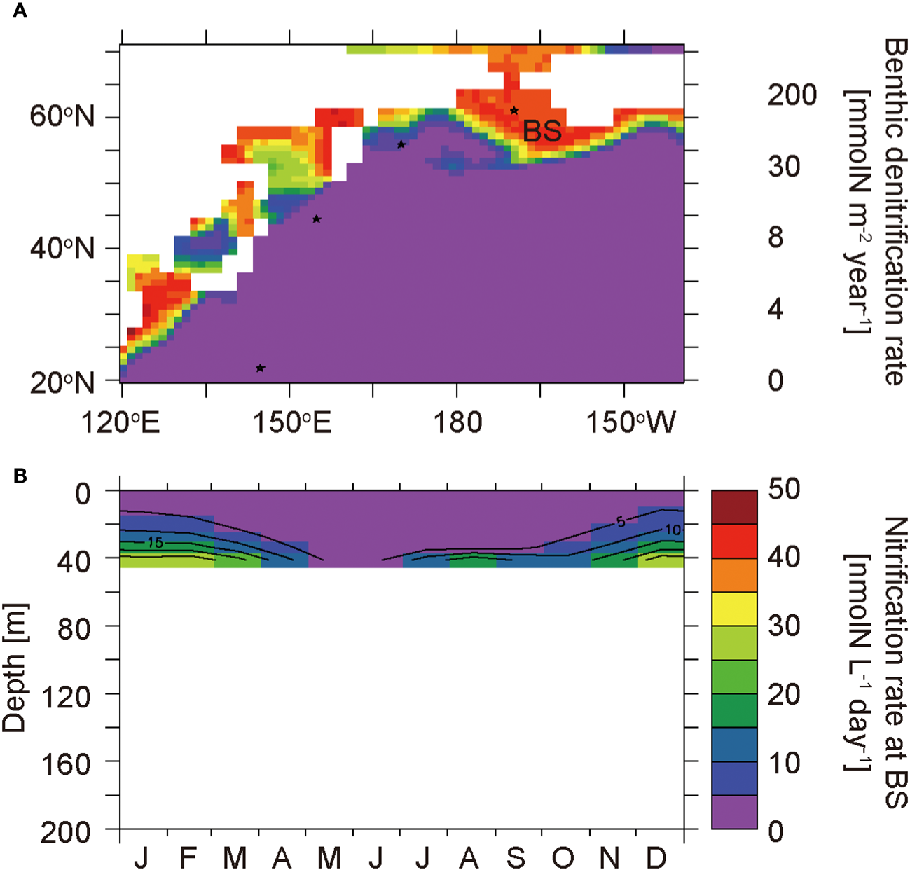 The benthic denitrification scheme is essentially the same as that reported by Shigemitsu et al. (2016). The benthic denitrification flux is parameterized based on the organic carbon flux to the seafloor (FPOC_bot) and bottom water O2 and NO3– concentrations ([O2]bottom and [NO3–]bottom) as: