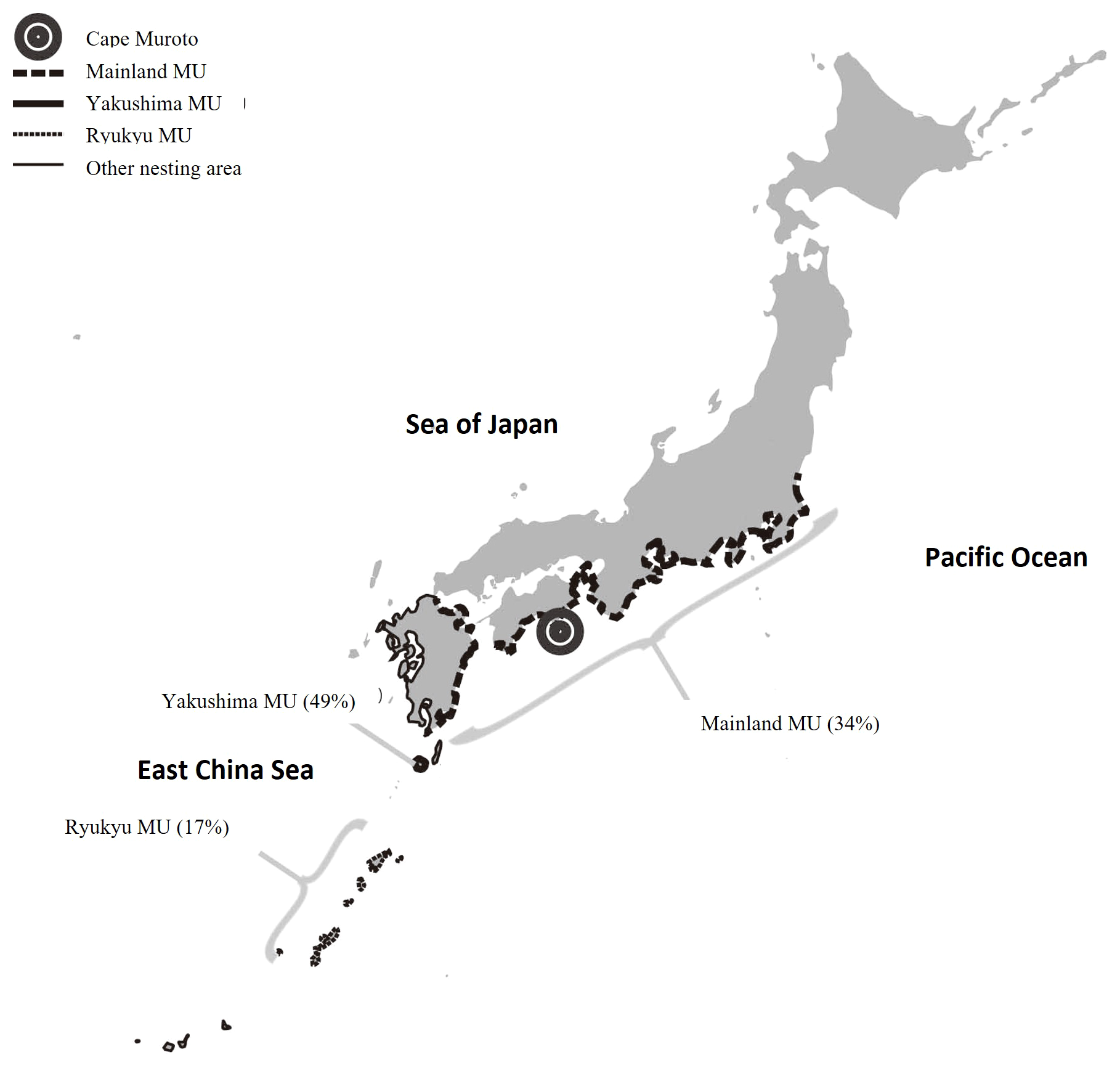 Fine scale nesting beach population structure has been determined for the North Pacific loggerhead population (Matsuzawa et al., 2016). Management Units (MUs) are defined as rookeries (or groups of rookeries) with significant differences in mitochondrial (mt) DNA haplotype frequencies (Moritz, 1994) and these populations are considered to be demographically isolated with respect to female natal recruitment. Three MUs known as Ryukyu, Yakushima Island, and Mainland MUs were identified in the North Pacific RMU (Matsuzawa et al., 2016).