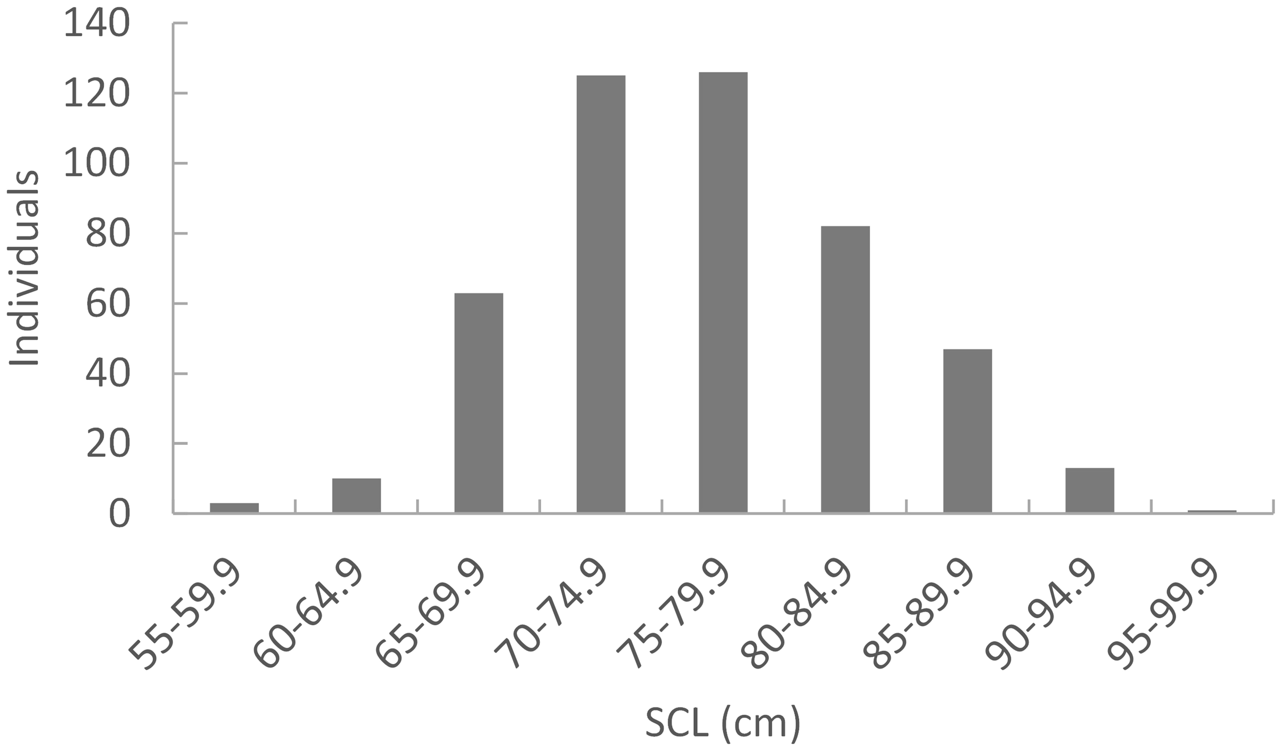 Size distribution of loggerhead turtle bycaught at large pound nets in Muroto, Shikoku, Japan (n=470). These individuals were randomly sampled and analyzed for mtDNA haplotype. Data adapted from Ishihara et al. (2011).
