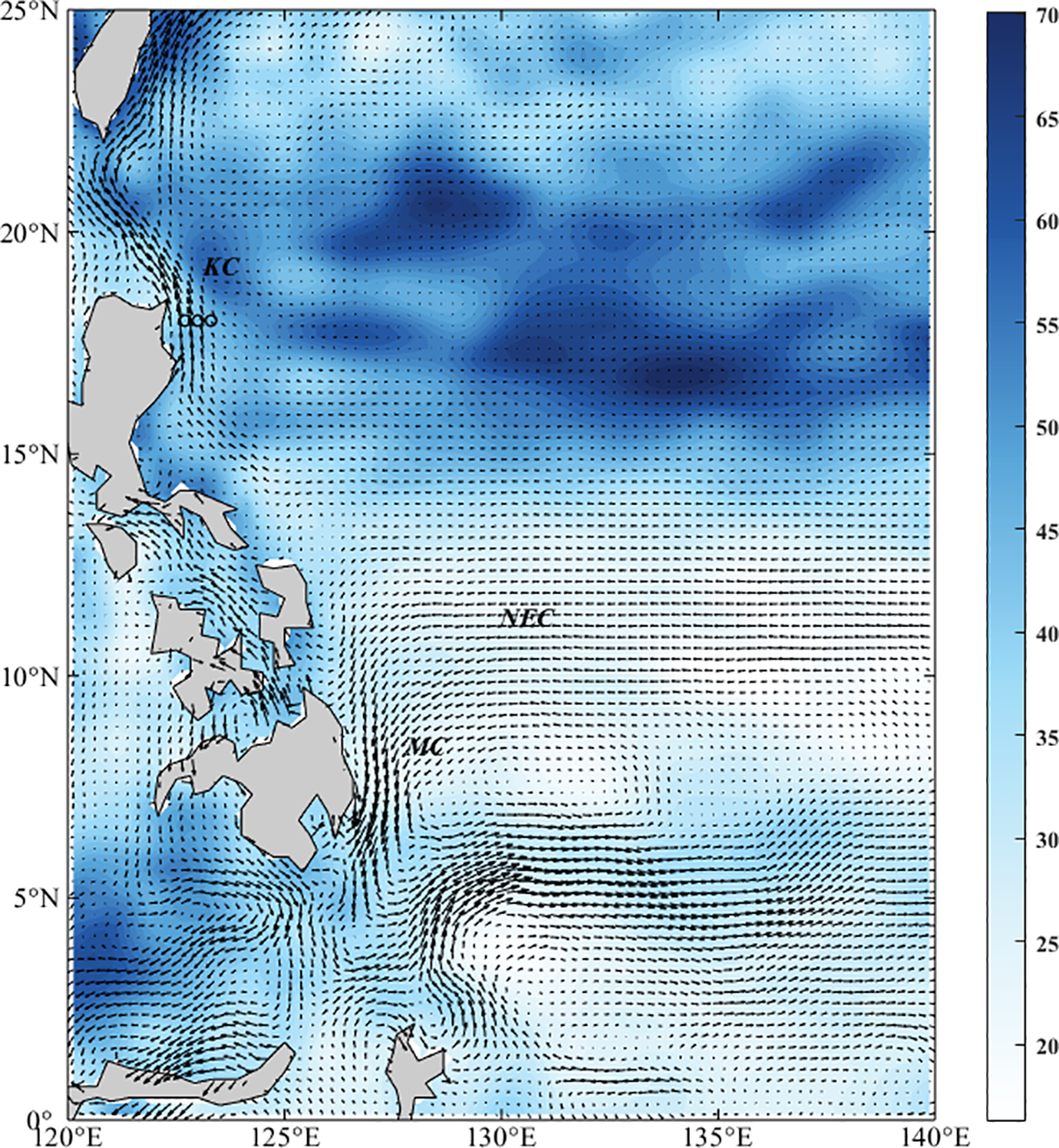 The North Pacific Low Latitude Western Boundary Current (WBC) system plays an important role in the global climate and ocean material cycle due to its complex three-dimensional structure and strong multi-scale variabilities (Lukas et al., 1996; Hu et al., 2015). The Kuroshio Current (KC), generated by the bifurcation of the North Equatorial Current (NEC) east of the Philippine coast (Zhai et al., 2014), flows northeast along the Philippines and partly enters the South China Sea through the Luzon Strait (Chao, 1991; Qu, 2001; Wu and Chiang, 2007; Qu et al., 2009). The remainder flows into the eastern area of Taiwan Island, the East China Sea, and the southeastern region of Japan (Hu et al., 2015). Beneath this current, a southward subsurface flow called the Luzon Undercurrent (LUC) exists, which was discussed by Qu et al. (1997) through 14 repeated hydrological observations along 18°N. In recent years, the velocity structure and origin of the LUC have been extensively studied (Xie et al., 2009; Hu et al., 2013).